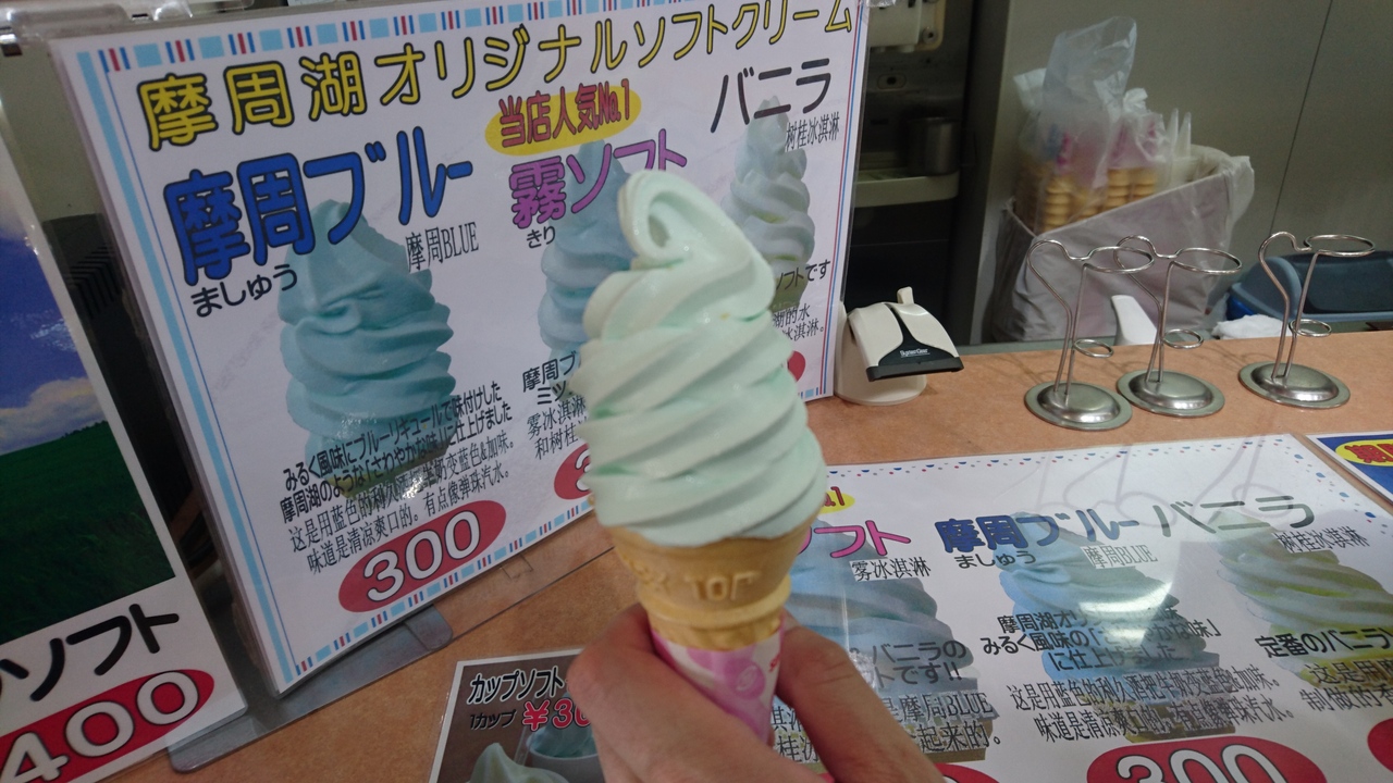イートインコーナーでは摩周湖を連想させる摩周ブルーのソフトクリームを販売していました。300円。