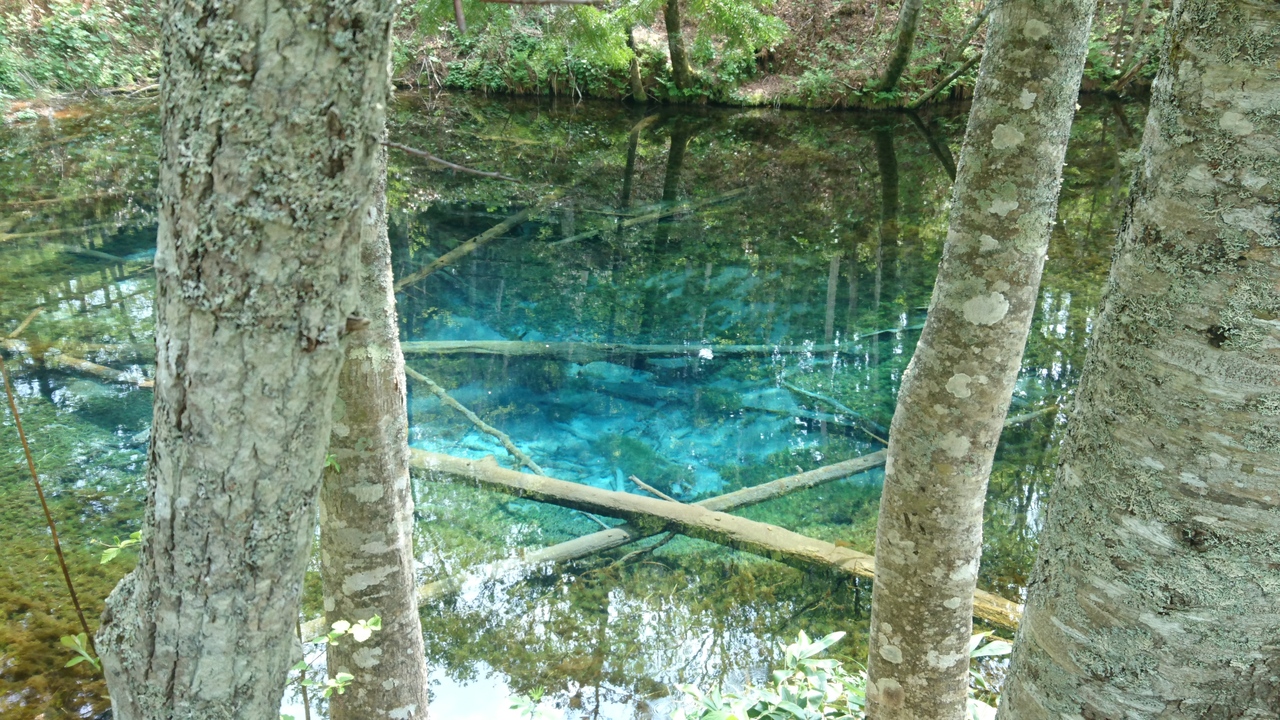 水温が年間を通して8℃と低く、倒木が青い水の中に腐らず化石のように沈んでいるのが見えました。