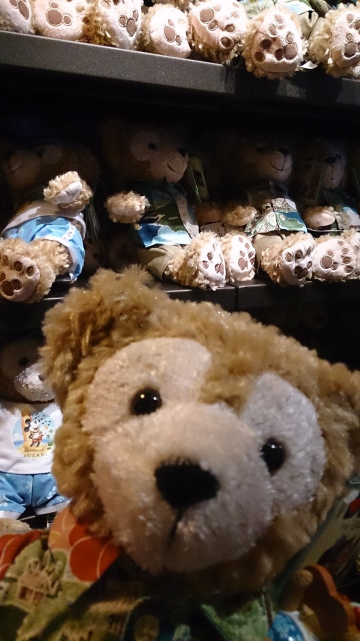 アウラニ限定のダッフィーのぬいぐるみが棚一面にズラリと並んでいます。