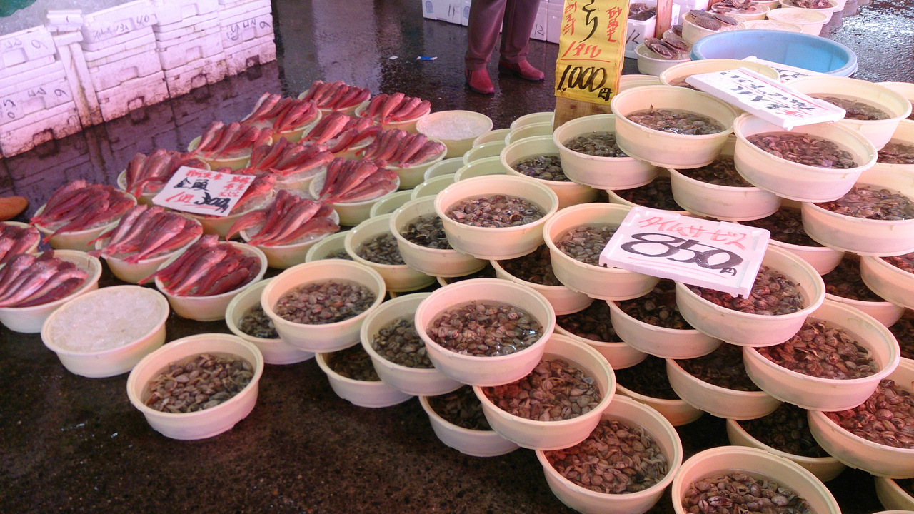 市場には新鮮な魚介類や塩辛などの加工品がズラリと並んでいて、試食もできました。