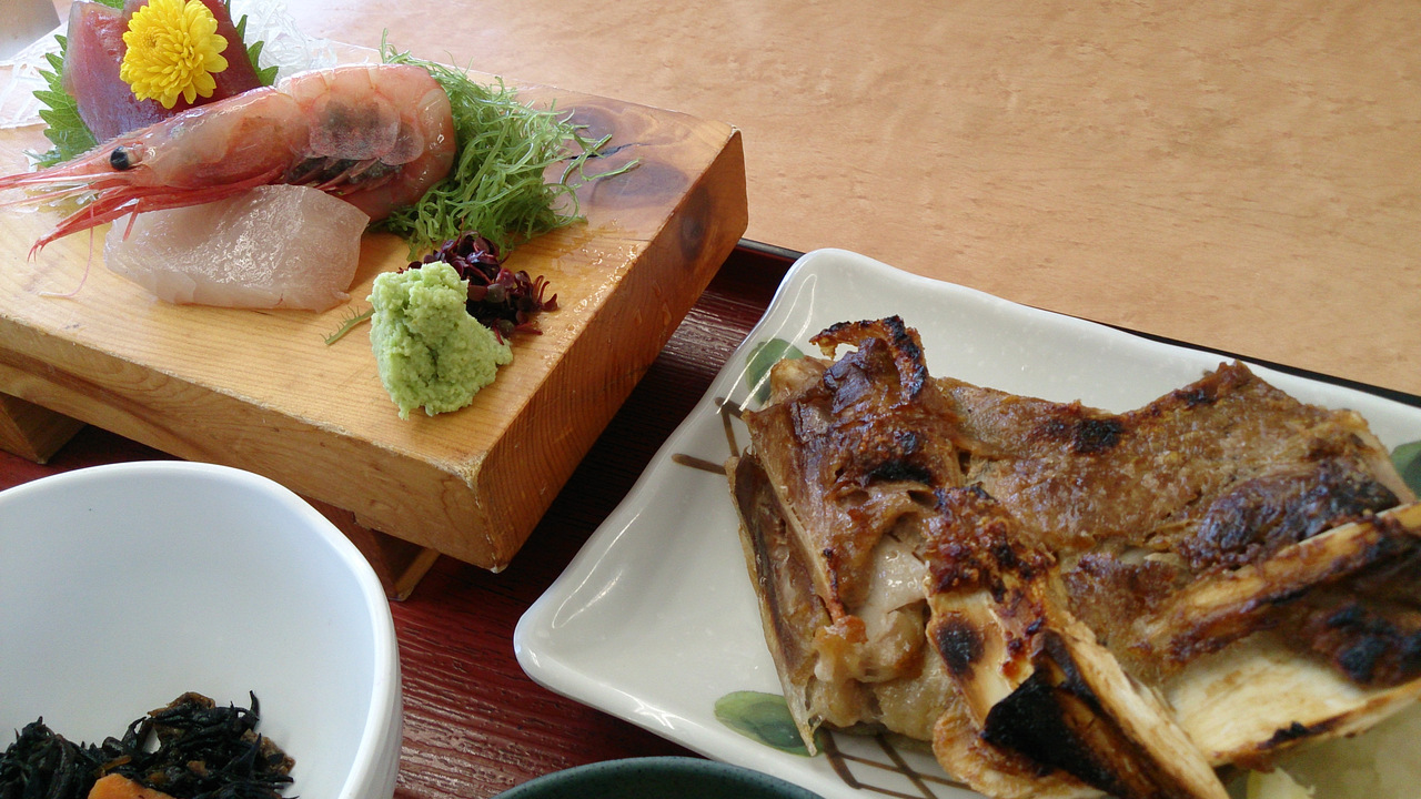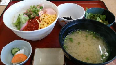 私たちは2階の食堂で、魚の刺身と炙りの定食といくらとねぎとろの二色丼を食べました。