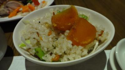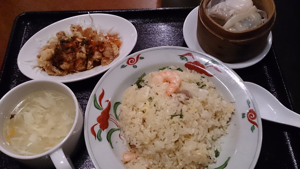 五目チャーハンと鶏の唐揚げ、スープ、点心三種。
