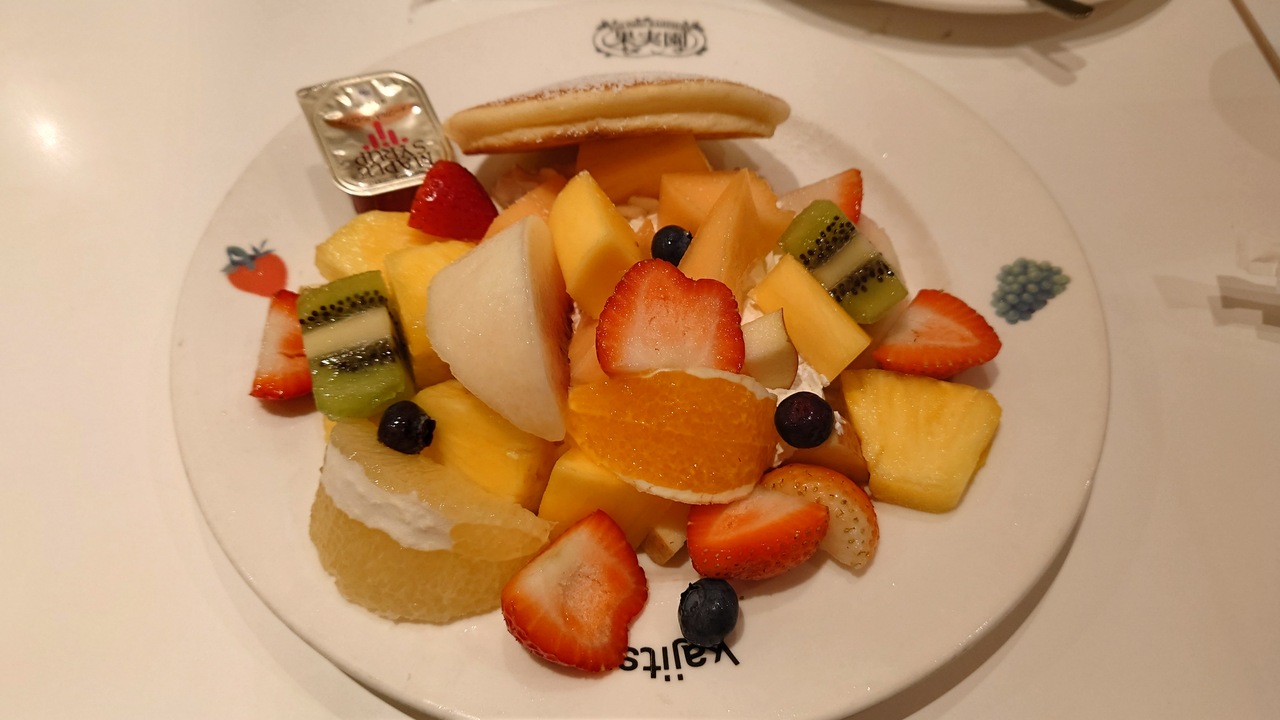 フルーツいっぱいのメニューがたくさんあったので迷いましたが、フルーツいっぱいのフルーツミックスパンケーキを食べました。
