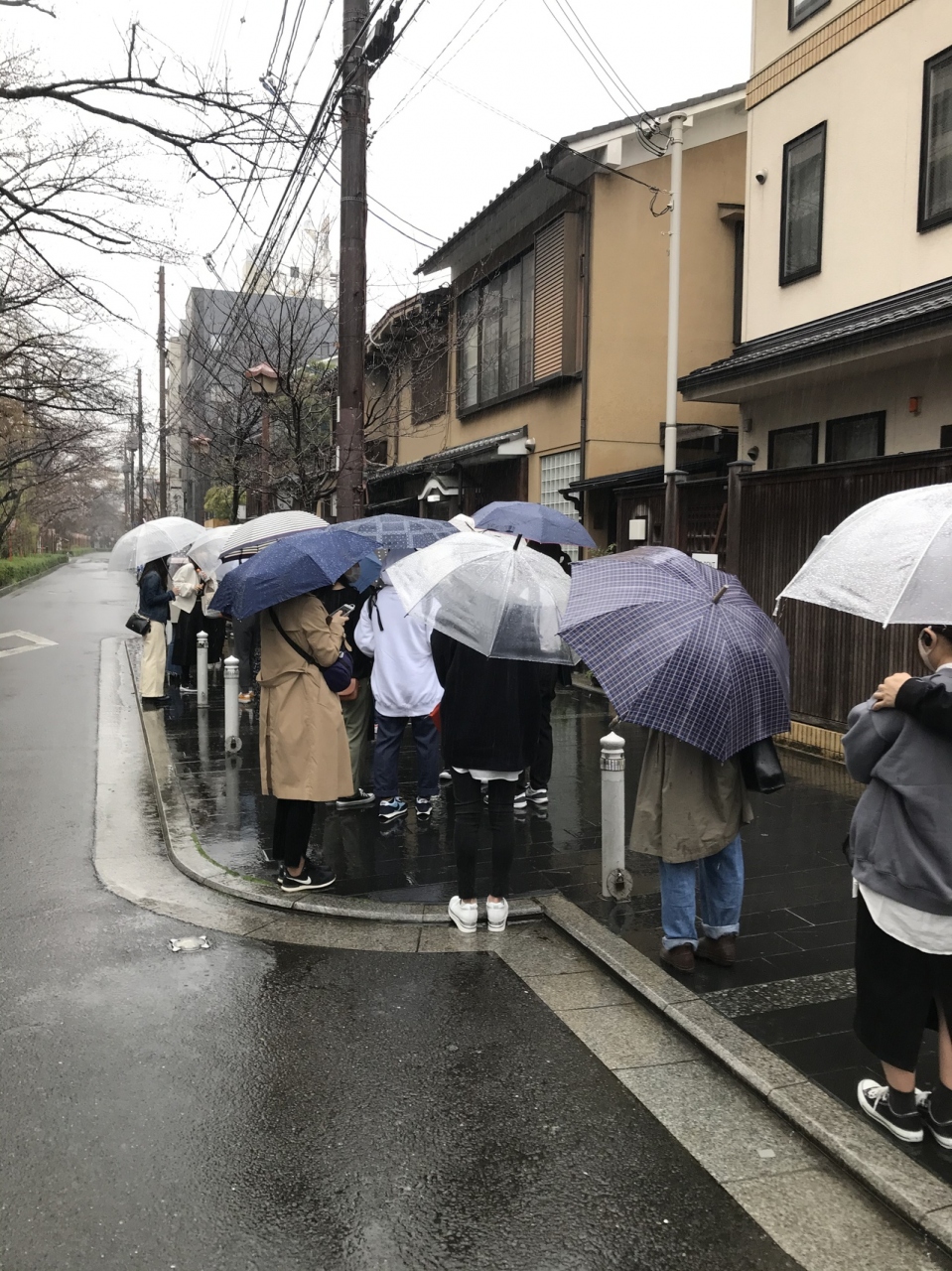 朝からあいにくの雨の中、ひたすら並ぶ。