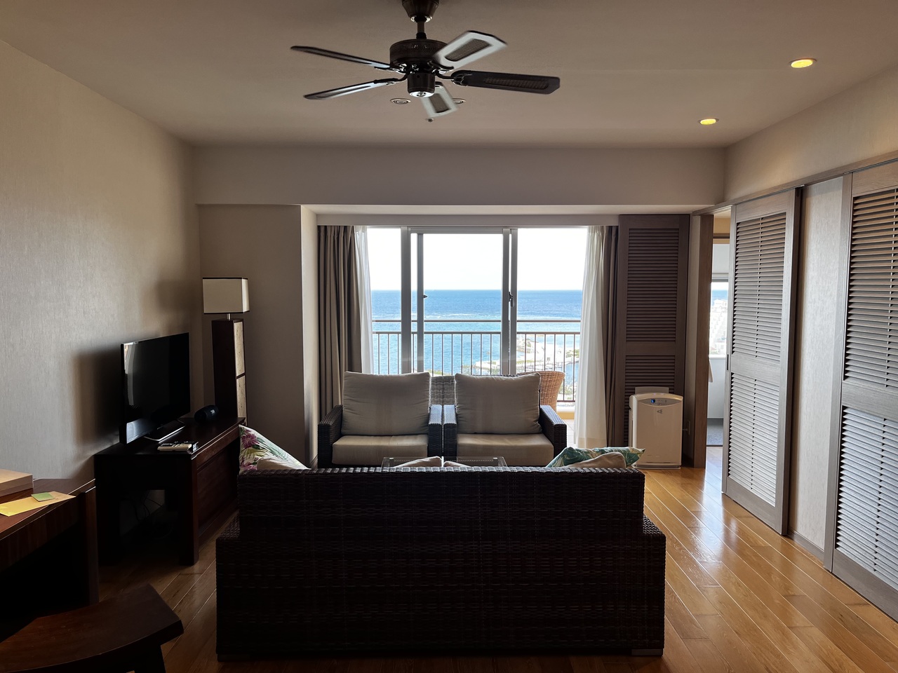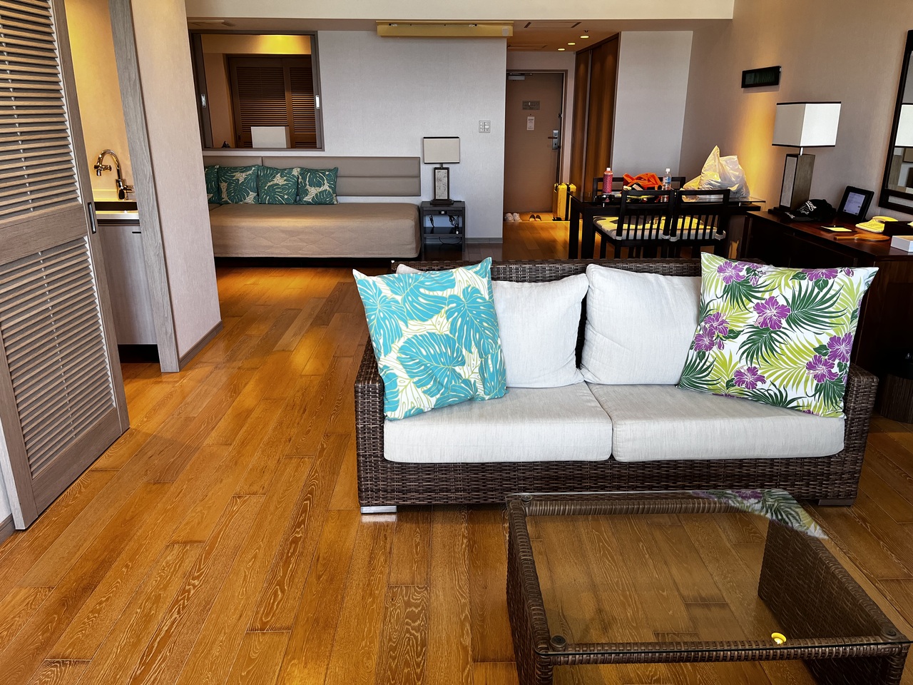 寝室とリビングも別で、お風呂もガラス張りで外の景色がみられる最高のリゾートホテルでした。