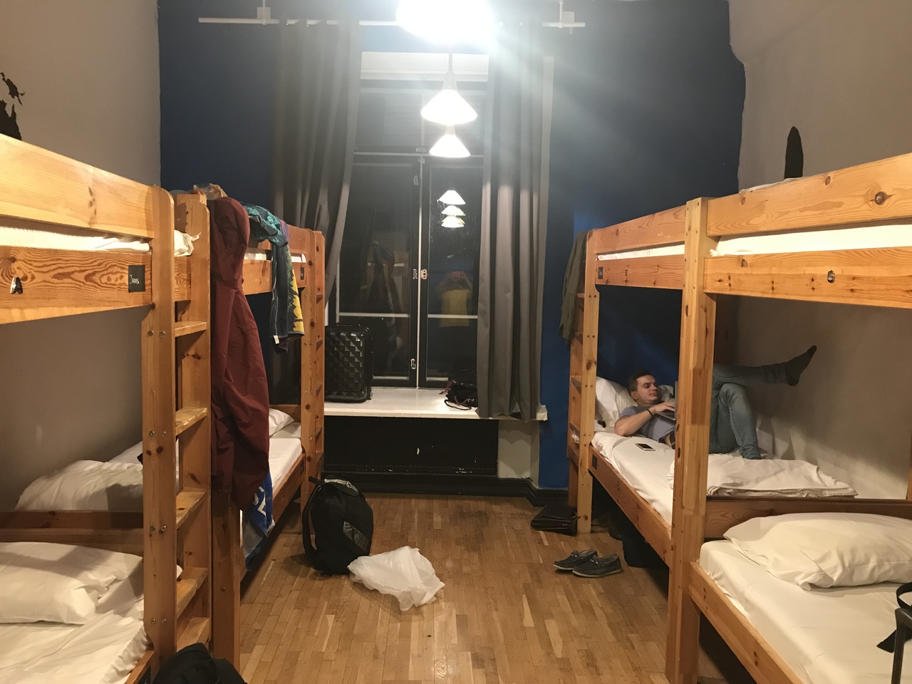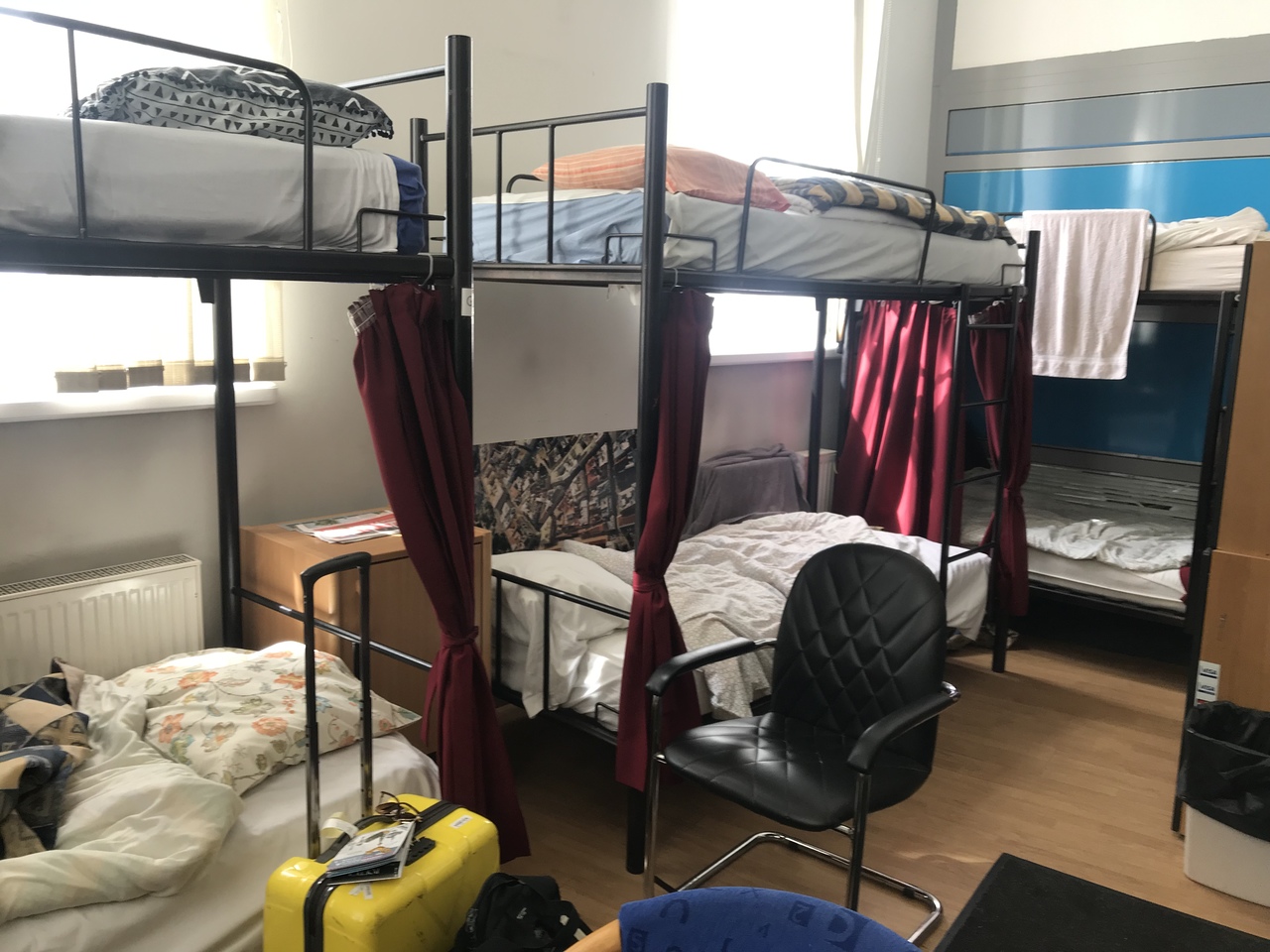 部屋はヨーロッパ風の簡素な二段ベッドの部屋。中庭が喫煙スペース。半地下がキッチンになっていました。シャワー・トイレが人数よりは少ないので夜や朝は並ぶ感じでした。- 旅行時期