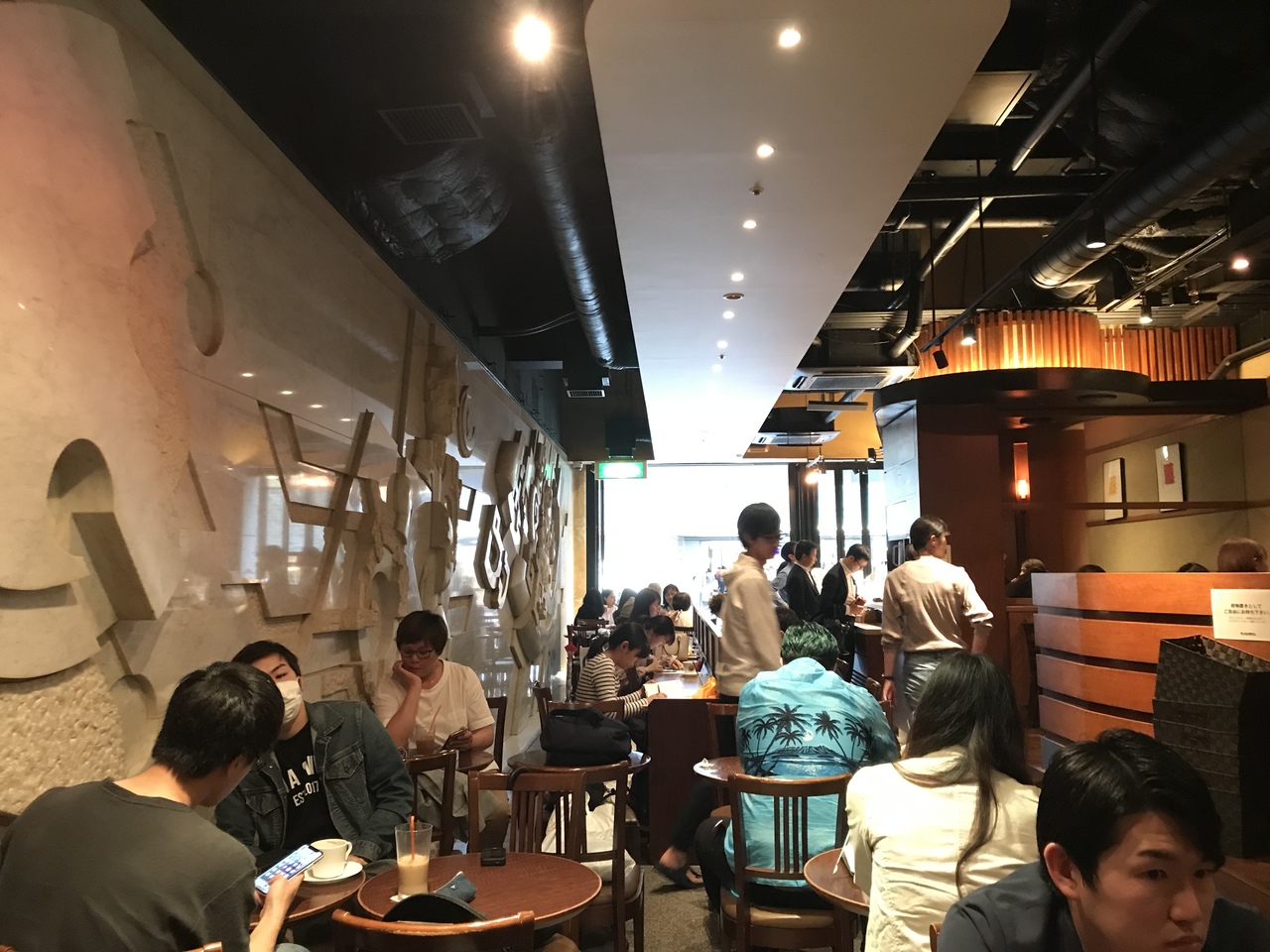 いつも混雑しているサンマルクカフェの茶屋町店。入口側はソファー席でゆったりしてますが、喫煙ブースです。奥側は禁煙スペースですがかなり窮屈なスペースの座席となります。