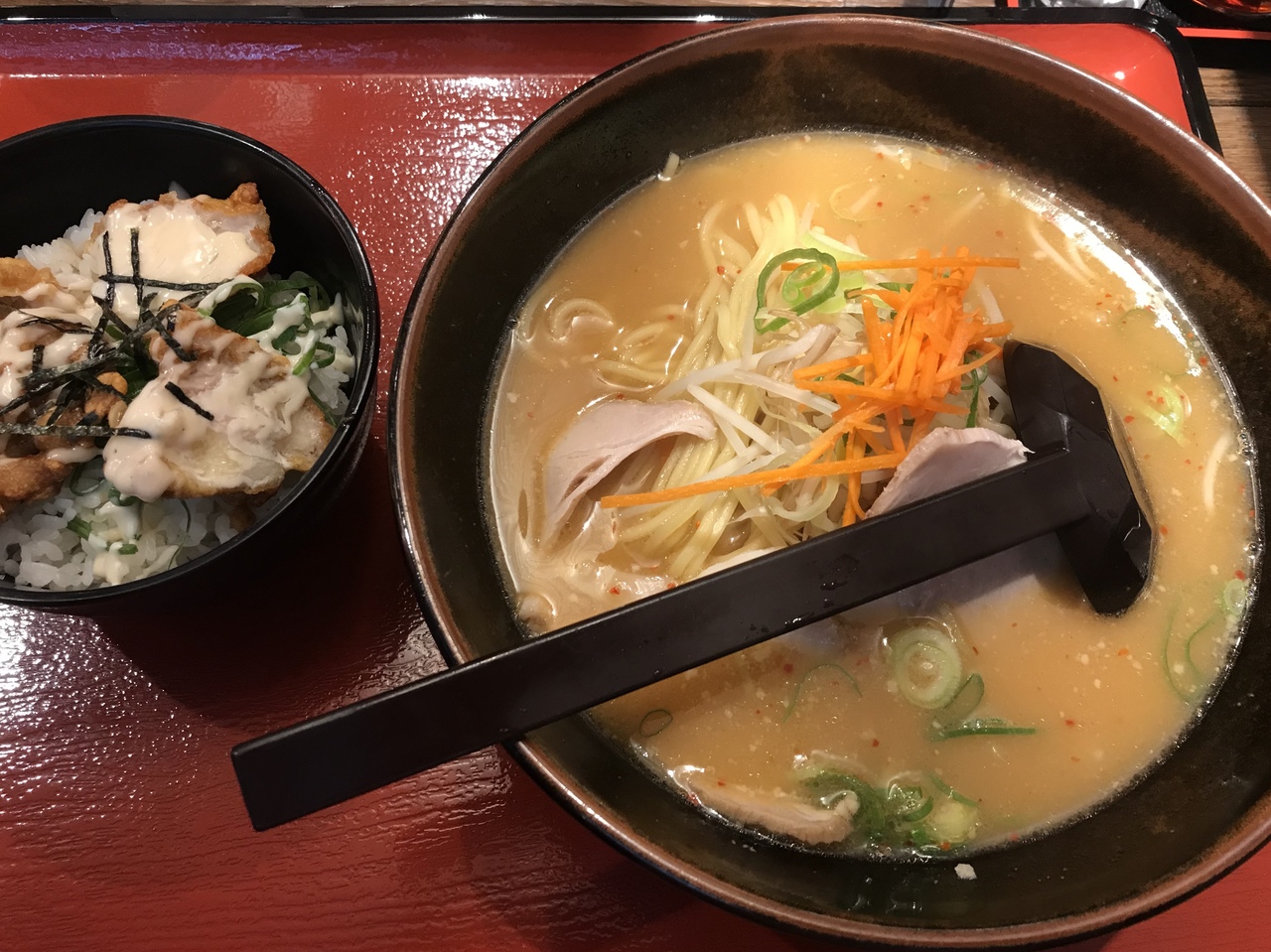 濃い独特の味噌スープに太麺が絡んで特徴の古潭のラーメン。