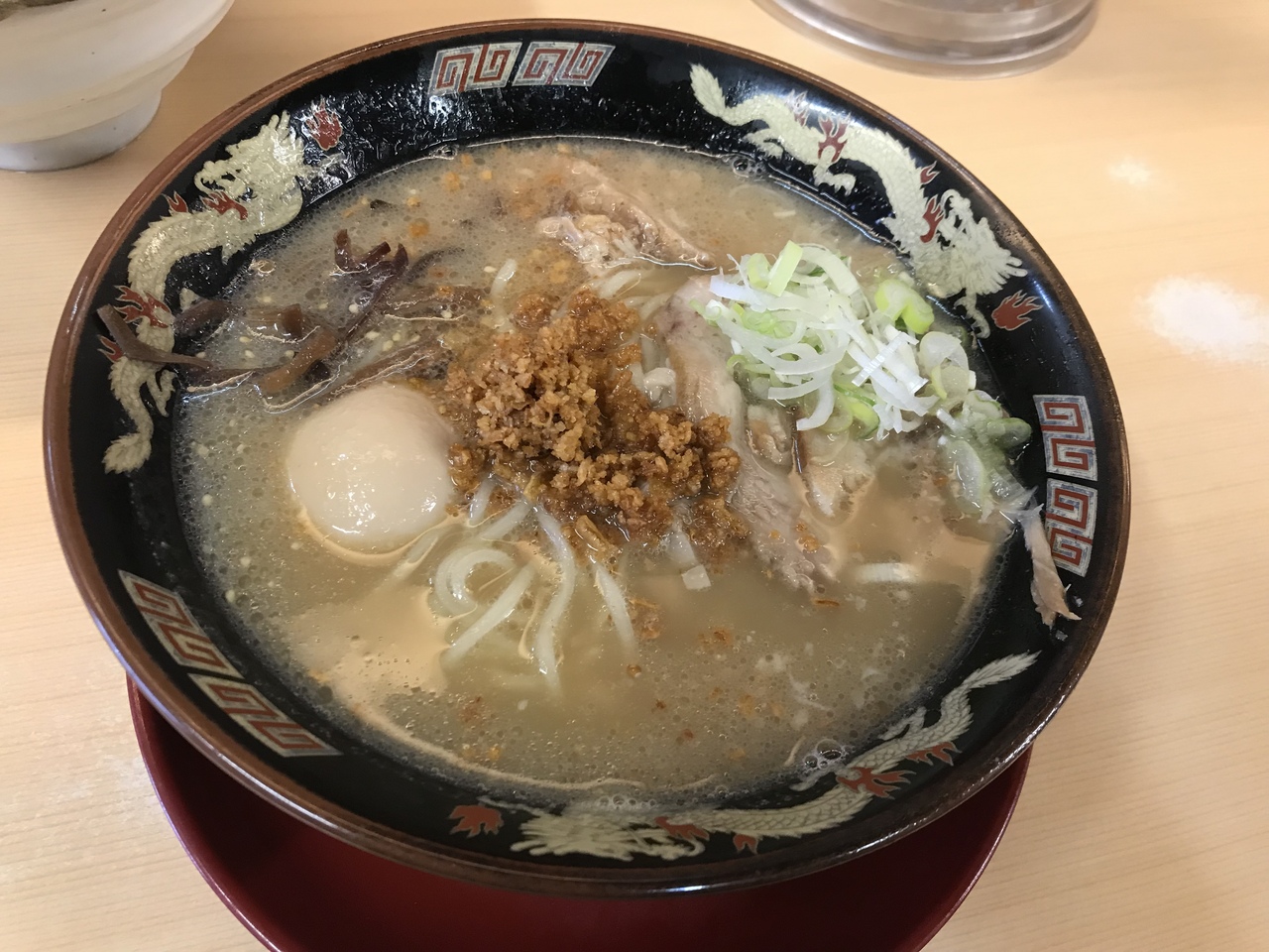 から揚げ定食を注文しました。ラーメンはこってりとあっさりを選べます。もちろんこってりで。から揚げがすごく大きいのがでてきてなかなかボリュームがありました。昼時は男子学生さんが多いわけですわ。笑