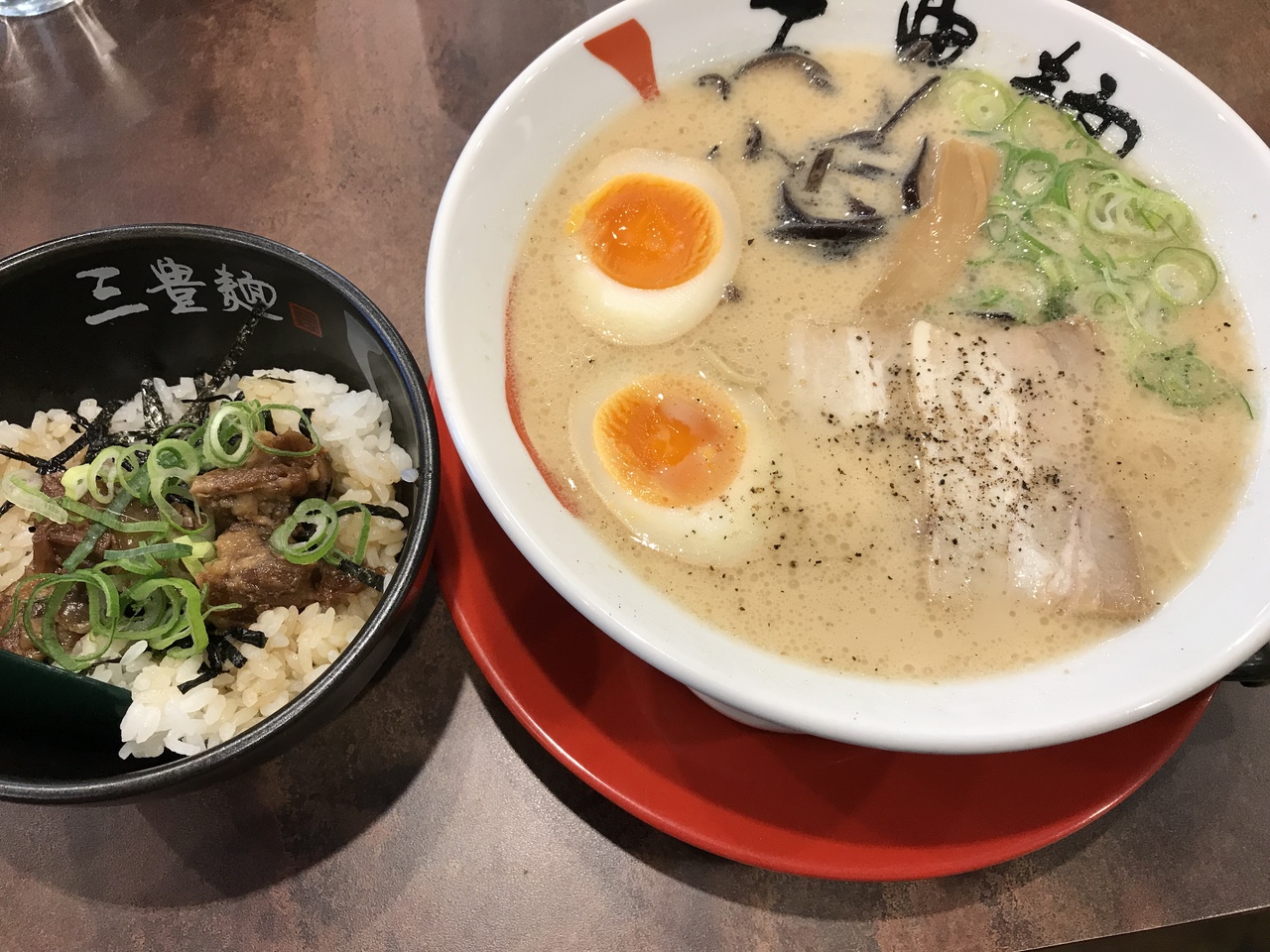 めっちゃラーメンが食べたくて、ぱっとお店の前を通っておいしそうだったのではいってみました。食券タイプのお店です。白豚骨ラーメンを注文。3のつく日はミニどんぶりが50円でめっちゃお得でした。ラーメンも濃厚豚骨スープでこってりした気分の日にはぴったりでした。