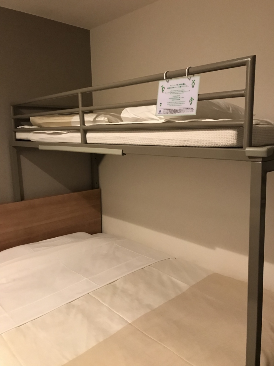 シングルで泊まってもいつも2段ベッドなのはスーパーホテルさんはどのプランも2段ベッドなんでしょうか?エコロハスに力をいれられていて、歯ブラシなどをフロントへ持参するとお菓子のサービスもありました。無料朝食も品数はそんなないですが、大阪名物としてたこ焼きや串カツなどもあってよかったです。部屋の入室には渡された番号を入力するシステムですのでチェックアウトはとくにフロントへ寄らずそのままチェックアウトという近代的なシステムでした。- 旅行時期
