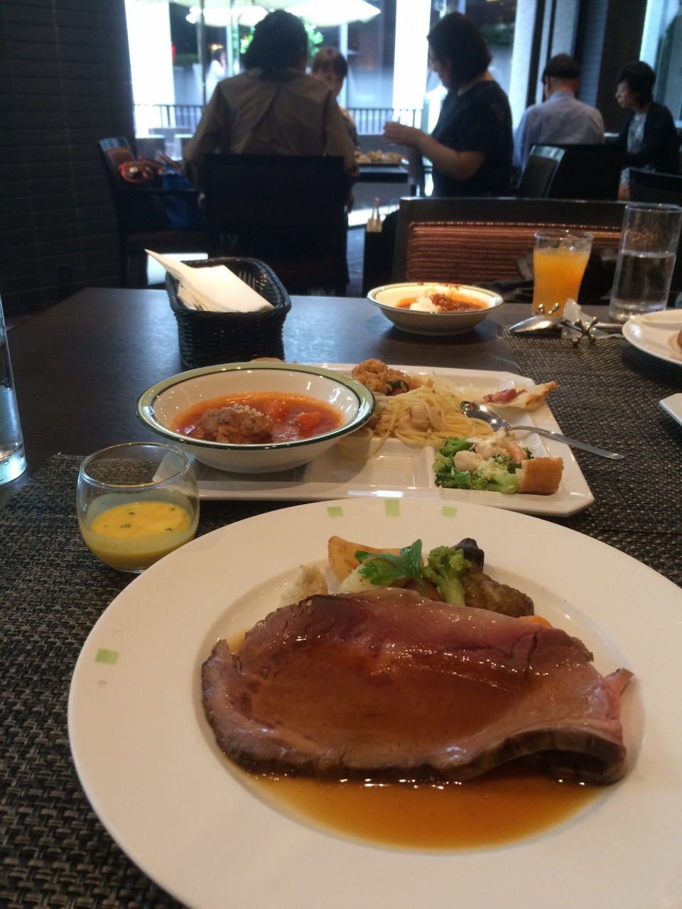 窯焼きのピッツアに出来立てのパスタ。デザートも充実していたランチブッフェでした。ローストビーフだけはテーブルへ運んでいただきました。特に時間制限もなくゆっくり食事もできておしゃべりが弾む賑わいのダイニングって感じでした。