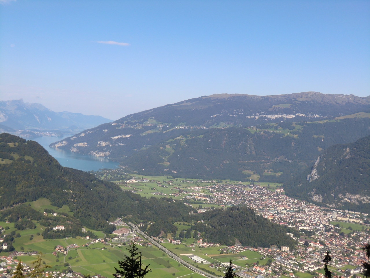 途中、標高が上がっていくと車窓からはブリエンツ湖とトゥーン湖に挟まれたインターラーケンの町を一望できます。