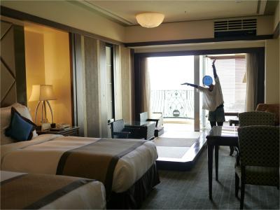 4.5スーペリアツインで予約していましたが、「空きがございましたので・・・」と、コーナースイートにアップグレードして下さいました。入ってすぐの、お部屋のリビングルーム...もっと見る