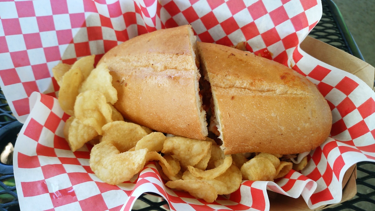 注文したオールドスクールサンドイッチは、15時間煮込んだカルアポークが挟んであります。カルアポークはハワイの伝統料理。気軽に味わえるのがいいですね。
