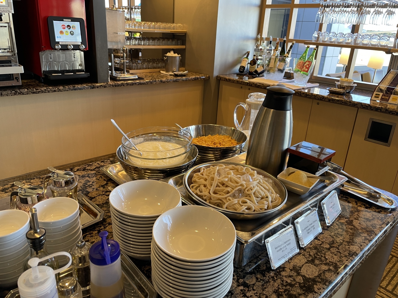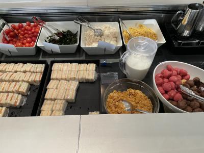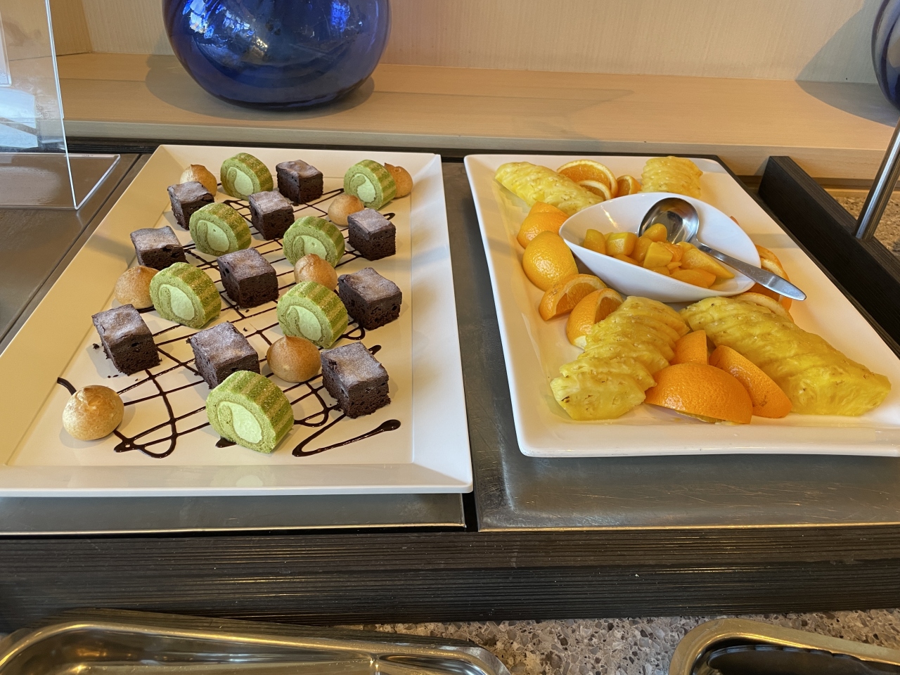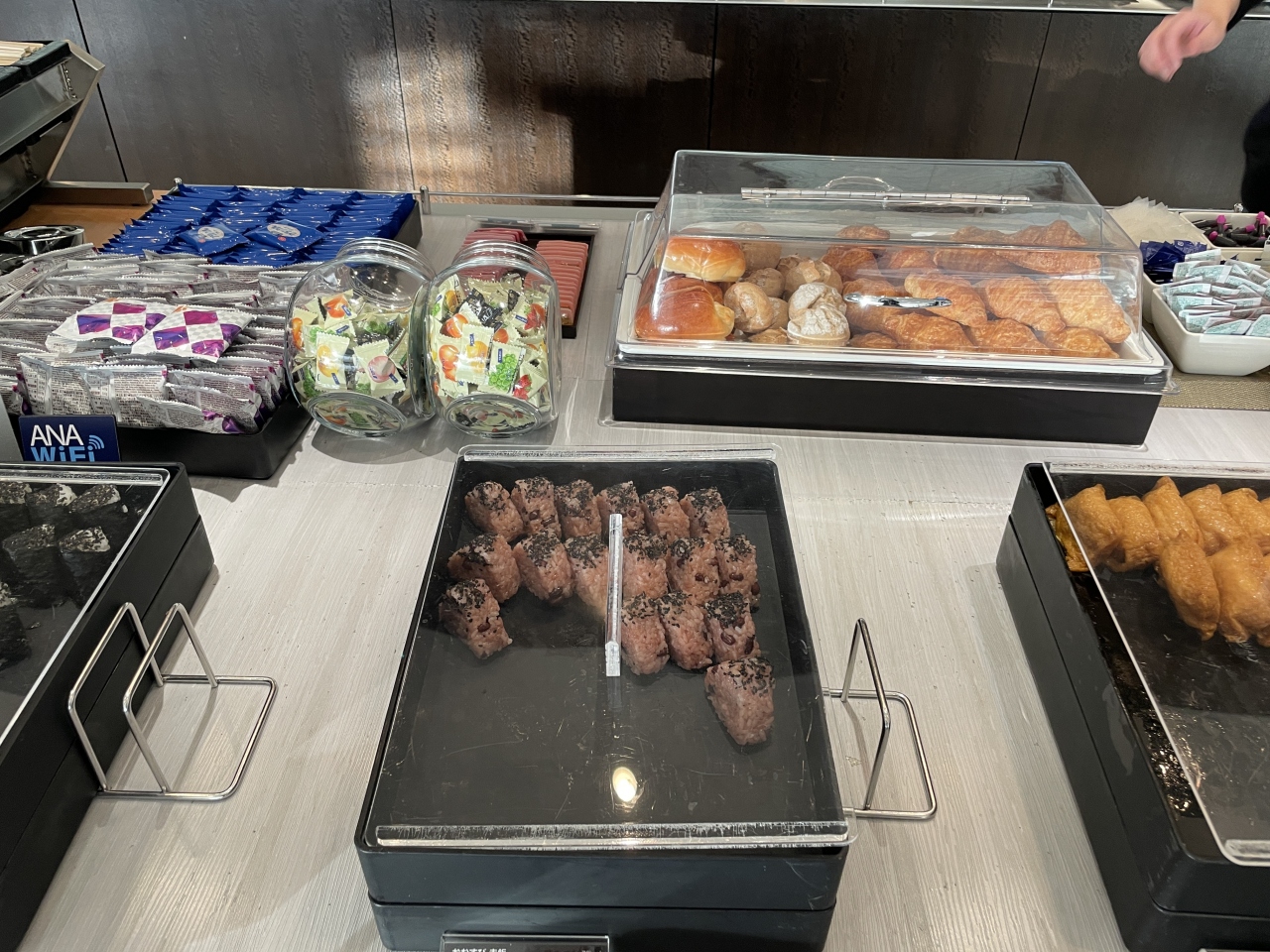 ANAラウンジの方が麺類をオーダーできるなど、食べ物の種類は若干多いような気がしますが、こちらにはANAラウンジにはない、フレッシュフルーツが置いてありました。朝だけかもしれませんが、おいしくいただきました。込み具合も、窓側のエリアは混んでいますが、奥のエリアはガラガラでした。- 旅行時期