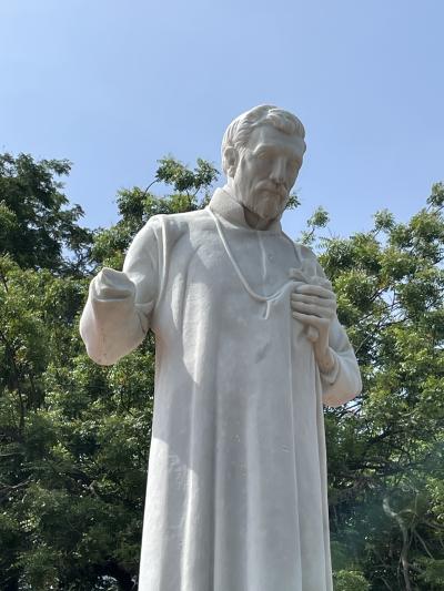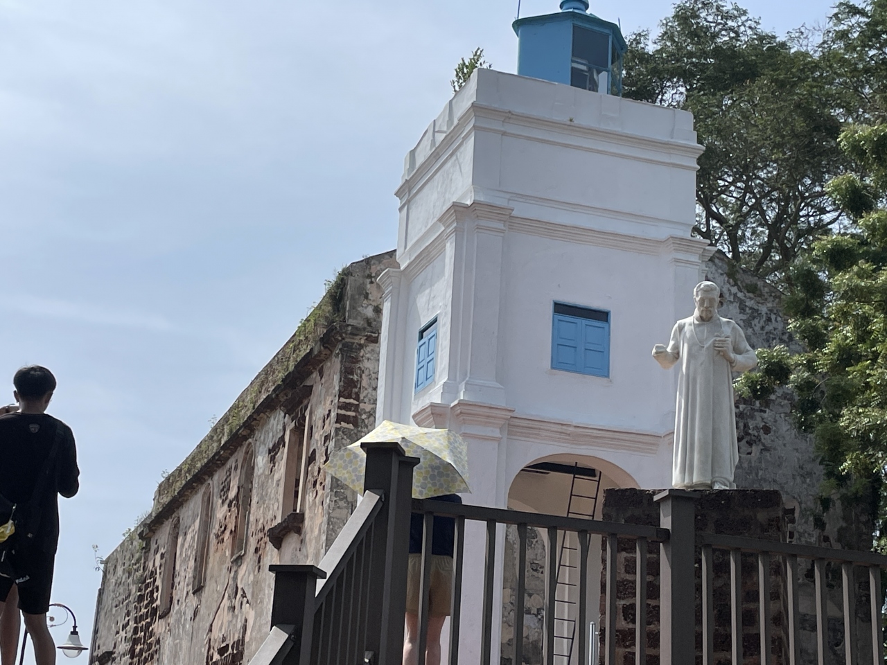 世界遺産のセントポール教会の前に立つ白いザビエル像です。
