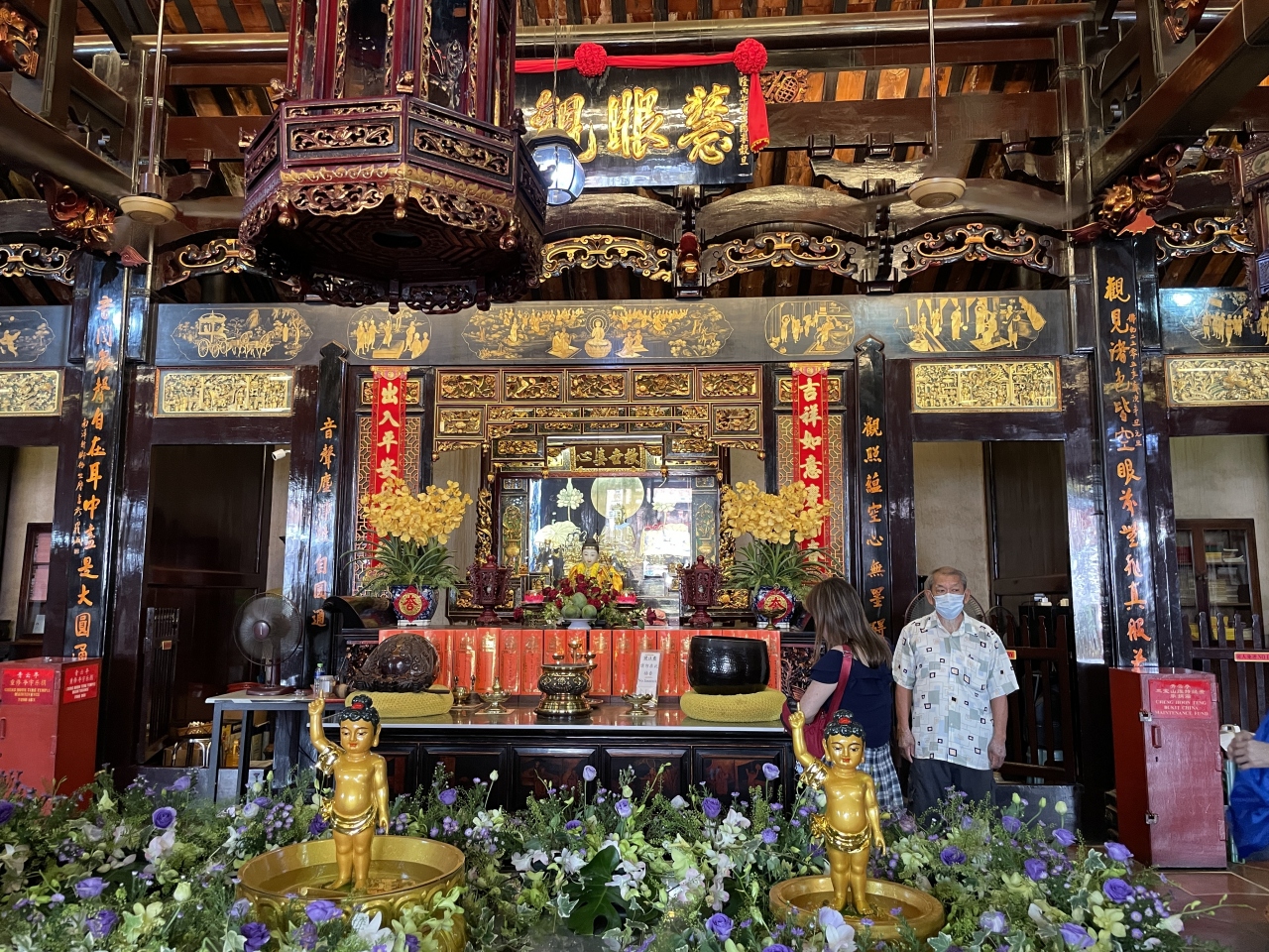 寺院に向かう道は、夜になると屋台が出てとてもにぎわうそうです。寺院も人気の場所のようで沢山の人が途切れずに参拝に来ていました。本堂には3体仏様がいらっしゃいますが、ご本尊は真ん中の観音菩薩様です。裏の方にも安産の神様など色々な仏様がいらっしゃいました。- 旅行時期