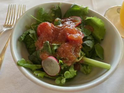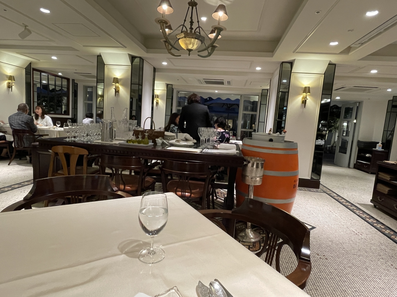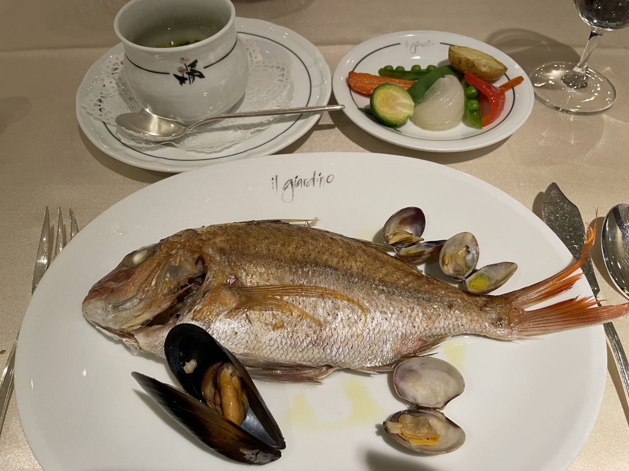 前菜、パスタと続いて出てきたのが真鯛のアクアパッツァ風。大きな真鯛が一尾まるごと出てきて、女性陣は軒並み半分以上残していました。ナイフとフォークなので食べづらいし、普通にアクアパッツアとして、切り身で出してくれたら美味しくいただけたのに、と残念です。ただ、骨を指で抜いたらすぐにさっとナフキンが出てくるところはさすがのサービスだな、と感心しました。- 旅行時期