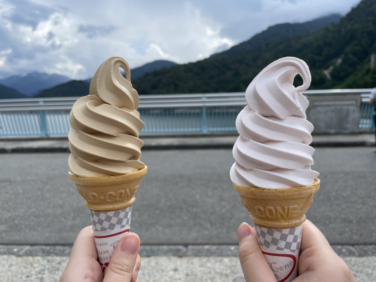 黒部ダム見学後、こちらのソフトクリームを食べました。フレーバーが珍しく、モカコーヒーや木いちご、バニラ、それぞれのミックスなど、各350円でした。モカコーヒーと木いちごを食べましたが、クリーミーできめ細かく、それぞれの味もしっかりしていてとてもおいしかったです。券売機で食券を買う方式でした。
