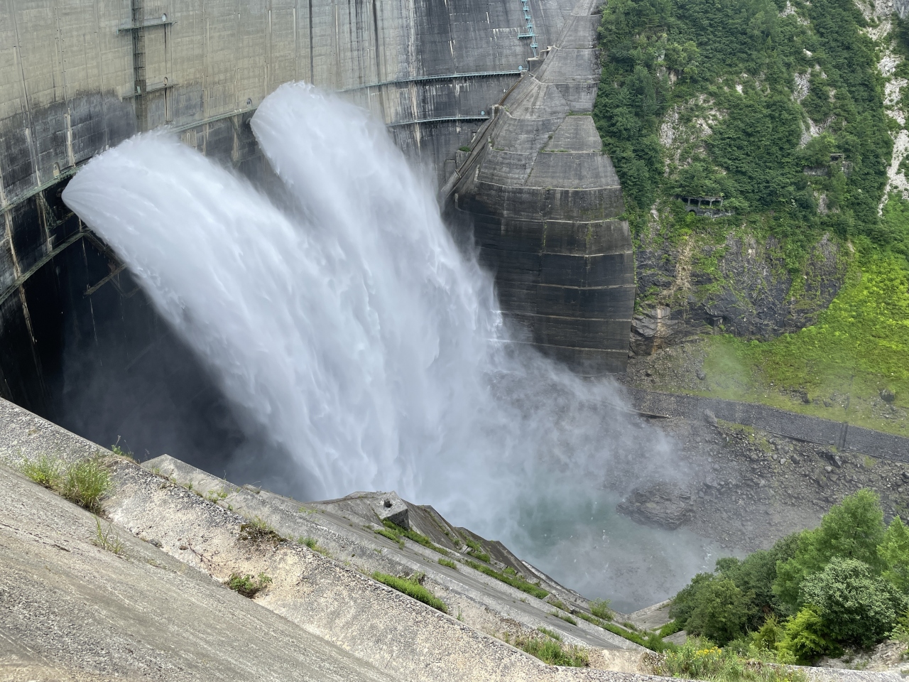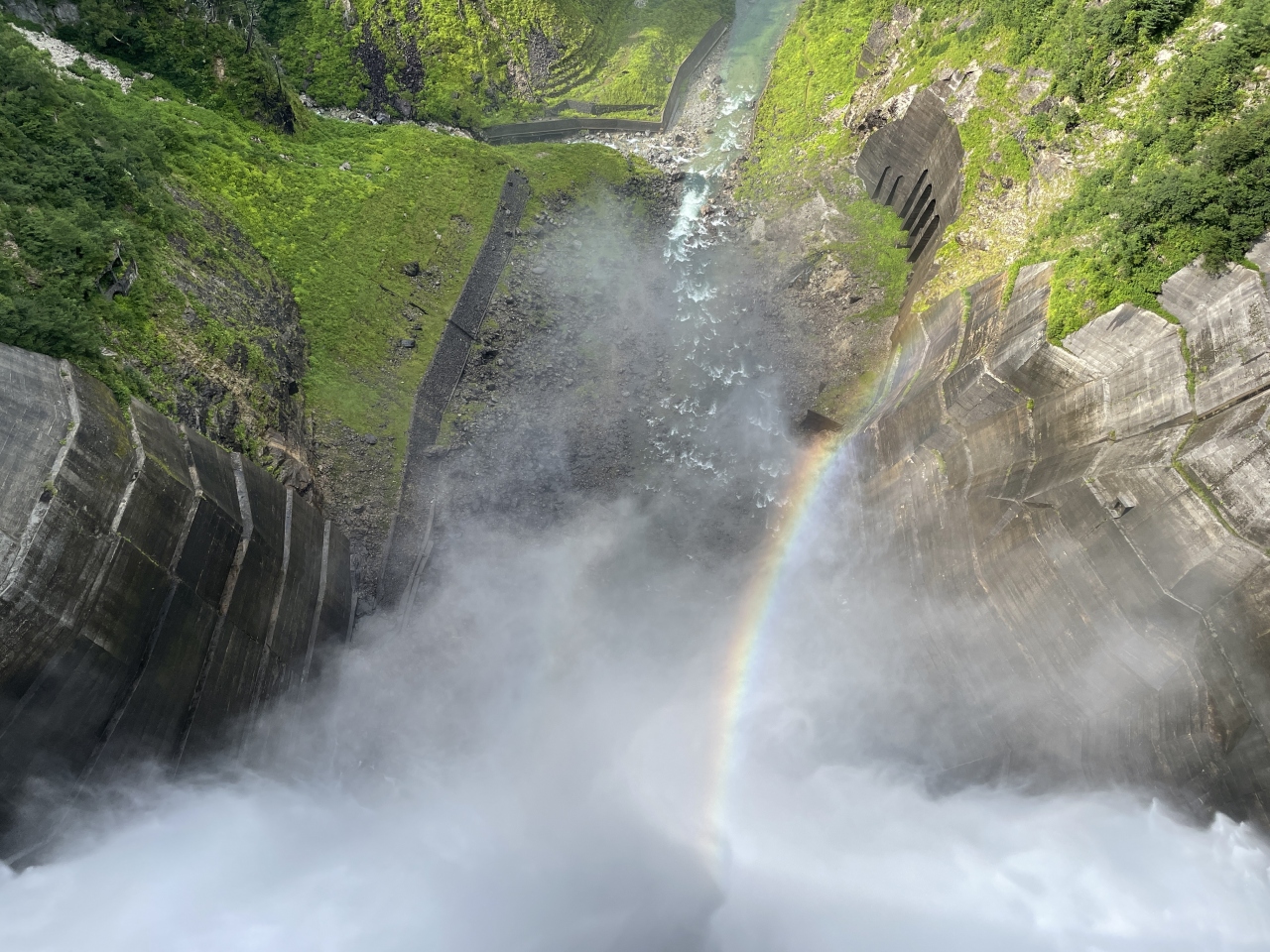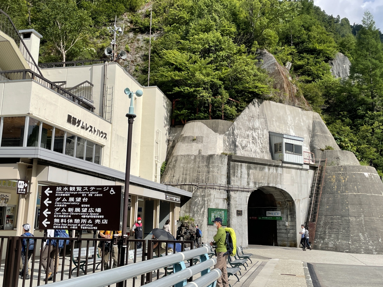 階段を130段降りた場所にある展望台です。下っていくので、黒部ダムの放水をより間近で見ることができました。展望広場の奥には黒部ダム建設に関する展示があり、どこの建築会社が何を担当したかなど興味深かったです。