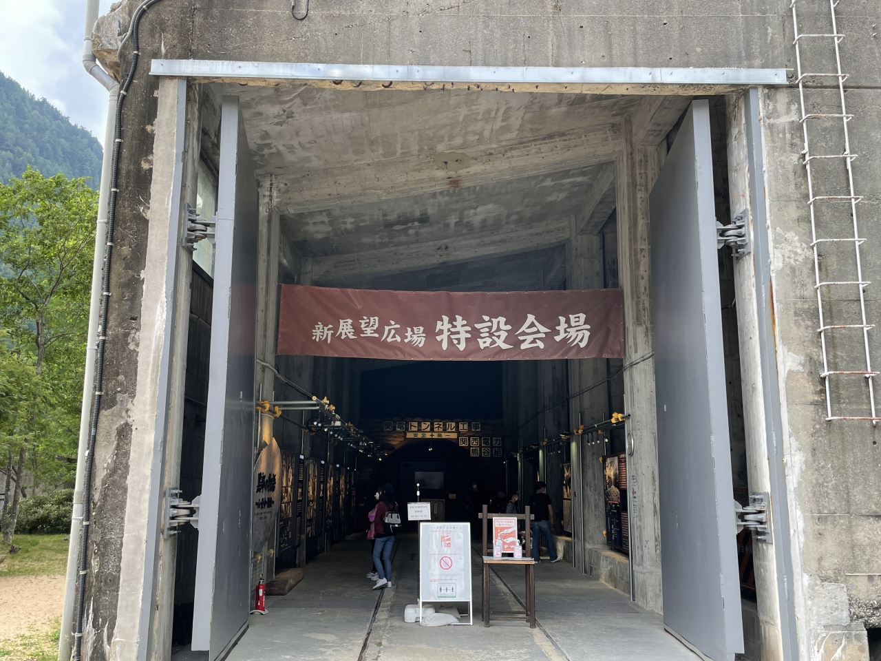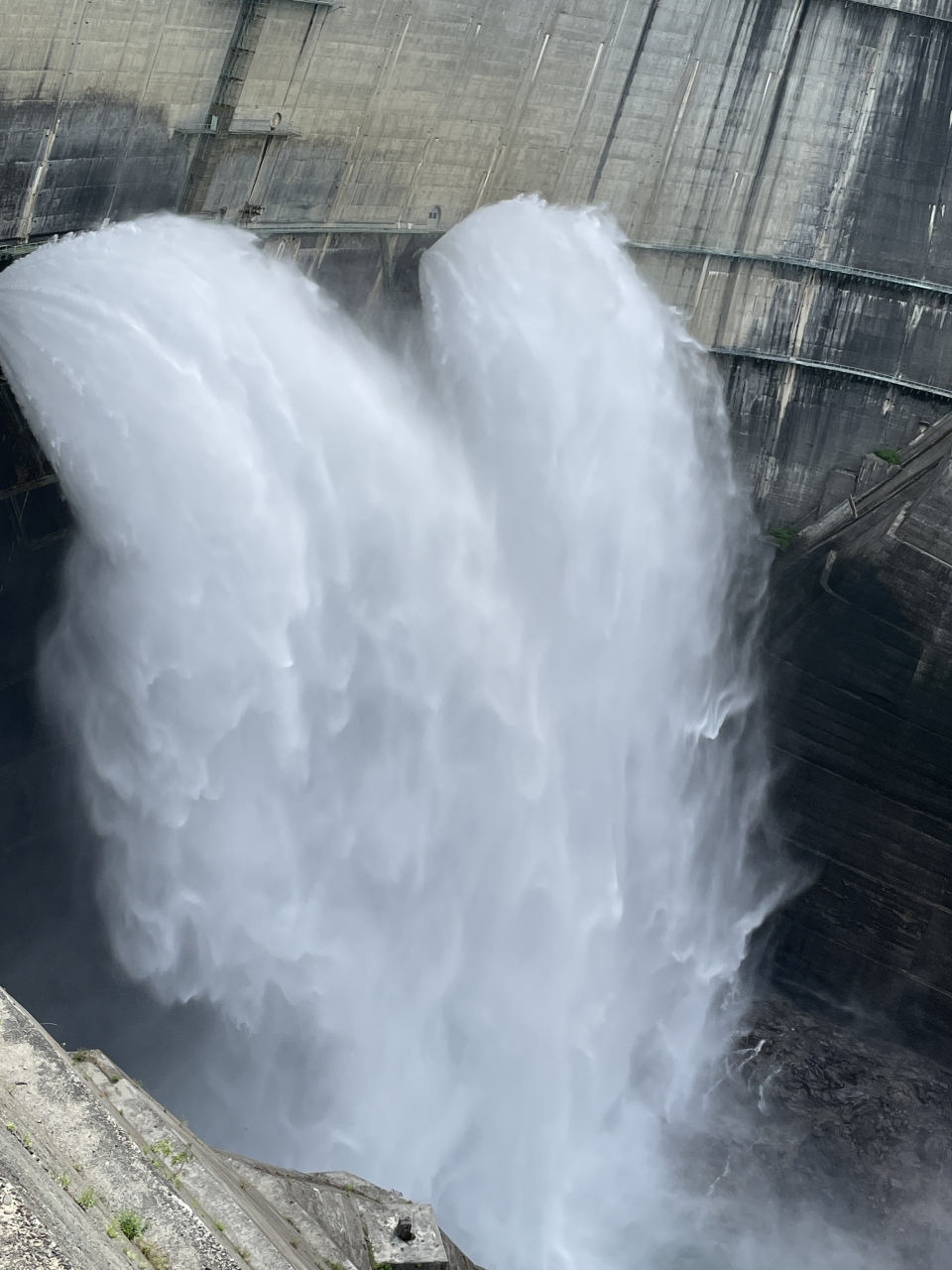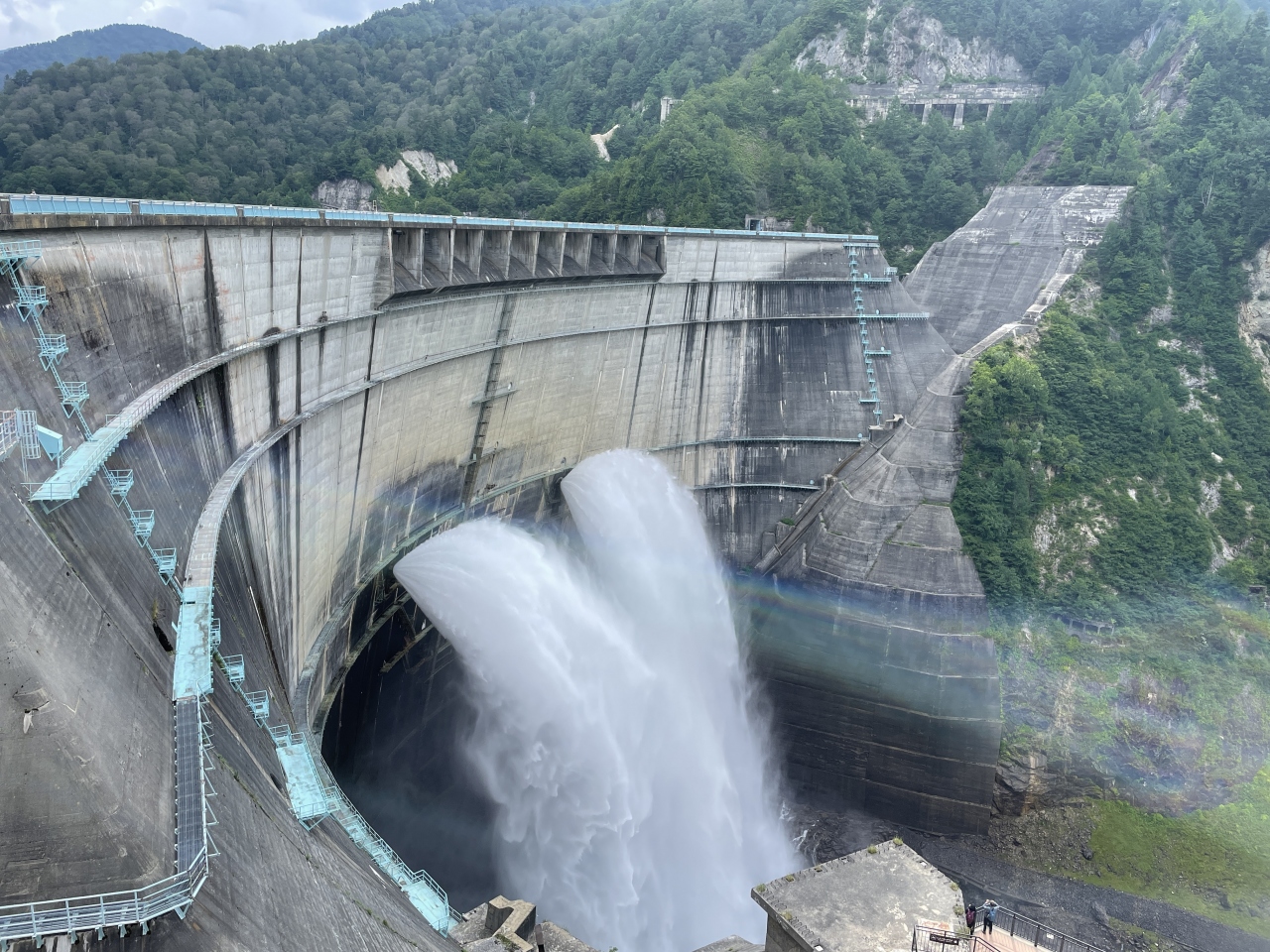 階段を130段降りた場所にある展望台です。下っていくので、黒部ダムの放水をより間近で見ることができました。展望広場の奥には黒部ダム建設に関する展示があり、どこの建築会社が何を担当したかなど興味深かったです。