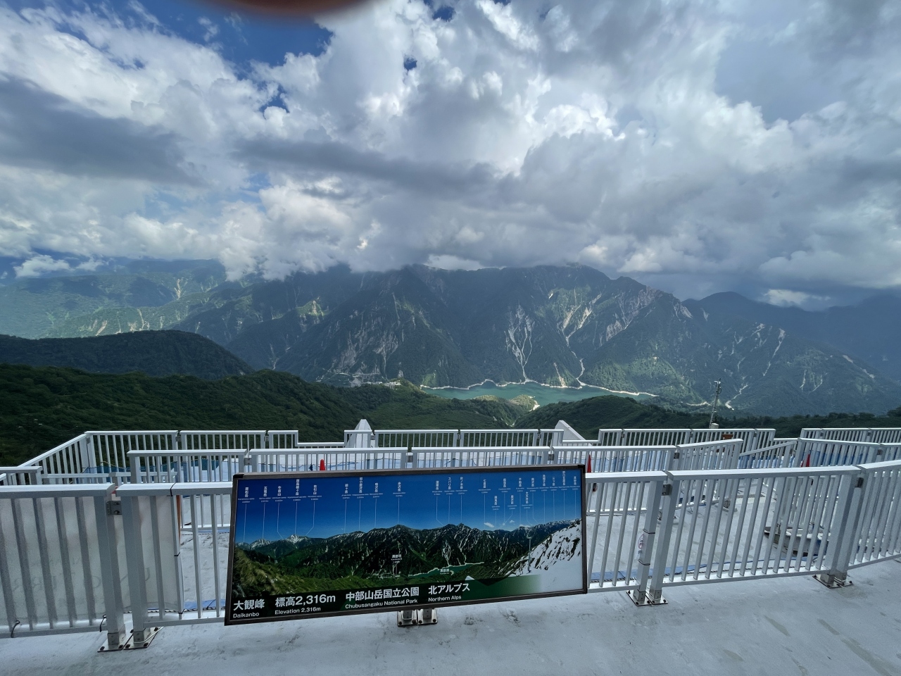立山黒部アルペンルートのトロリーバスとロープウェイをつなぐ駅に展望台があります。駅から54段ほど階段を登ると展望台で、山の名前の展示もあります。54段が辛い方は、登らない場所にも展望台があるので、少し低くなりますがそちらからも景色が楽しめます。