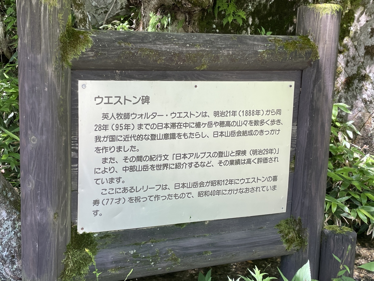 田代橋から河童橋へ向かう途中、上高地ルミエスタホテルを通り過ぎて左後ろを振り返る辺りに小さな碑があります。案内板の方が大きく見えるほどの小さな碑です。登山を嗜まないので知りませんでしたが、登山家には有名な方のようです。