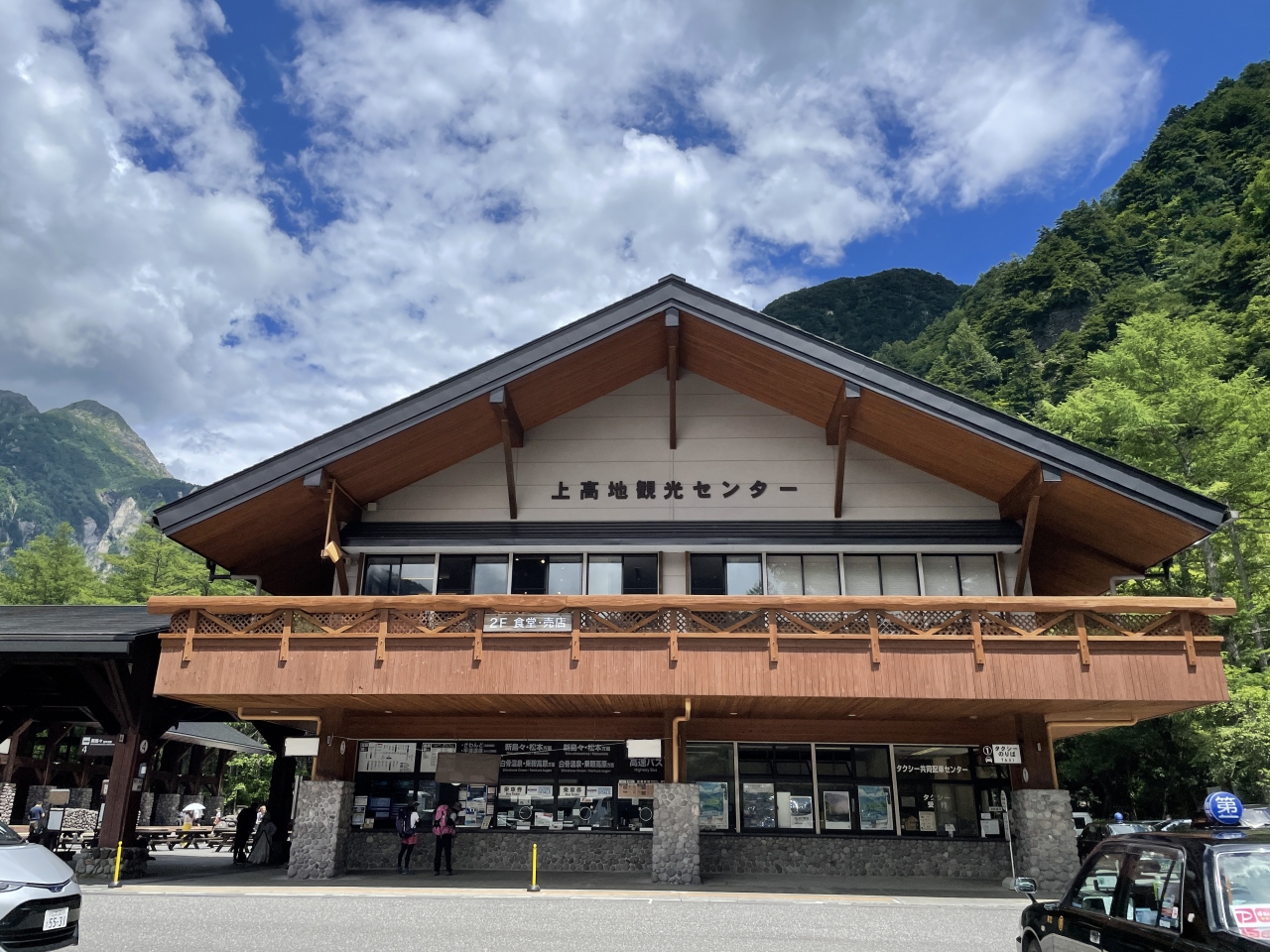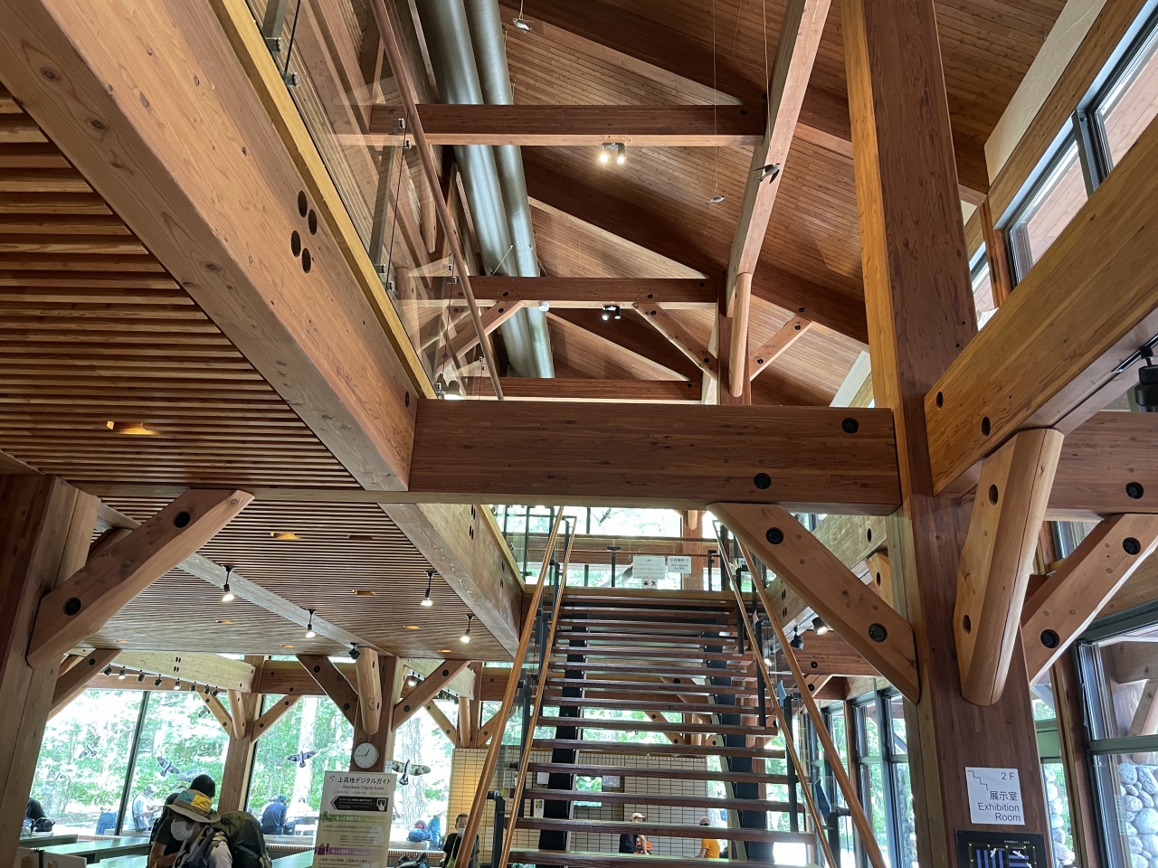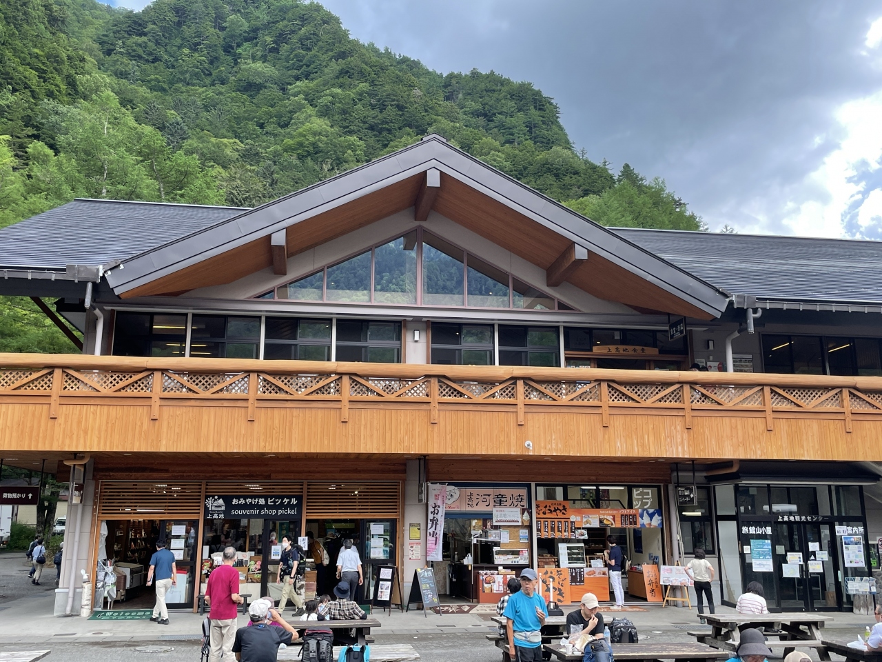 上高地バスターミナルに隣接する建物で、1階にたくさんのベンチが並んでおり、「黙食」と貼ってあるものの、飲食は可能なようです。私たちが行った時2階では上高地を写した写真展を開催していました。外側にも建物に沿って並ぶようにベンチが置かれています。フリーwifiも使えました。