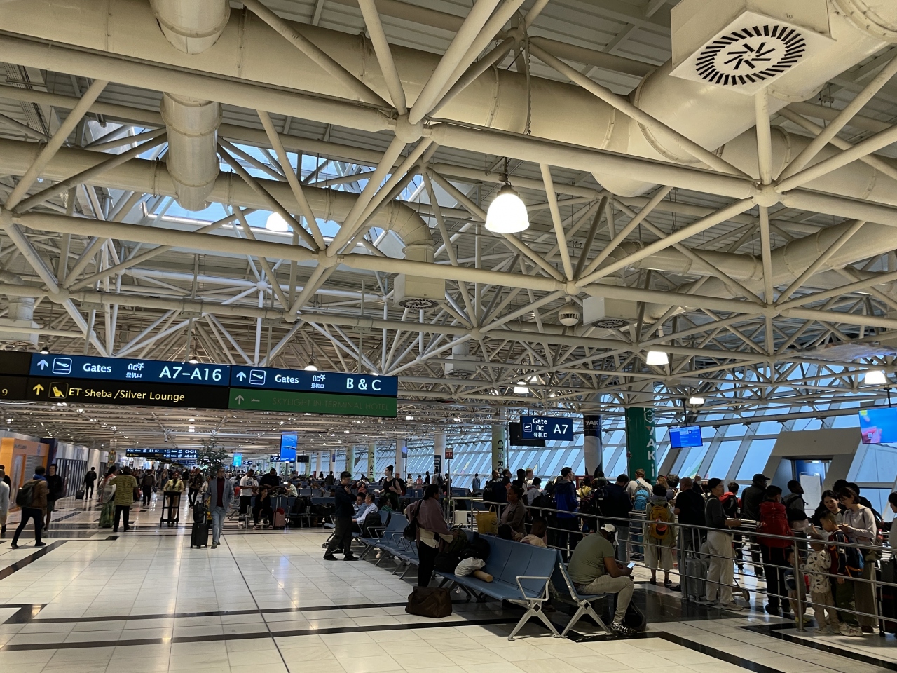 空港はそこそこ広いですが、私が利用したAターミナルはゲートが1から7まで一列に並んでいるので迷うことはありません。アフリカ各地からの便が乗り入れているので様々な衣装を着た人々が行き交っています。