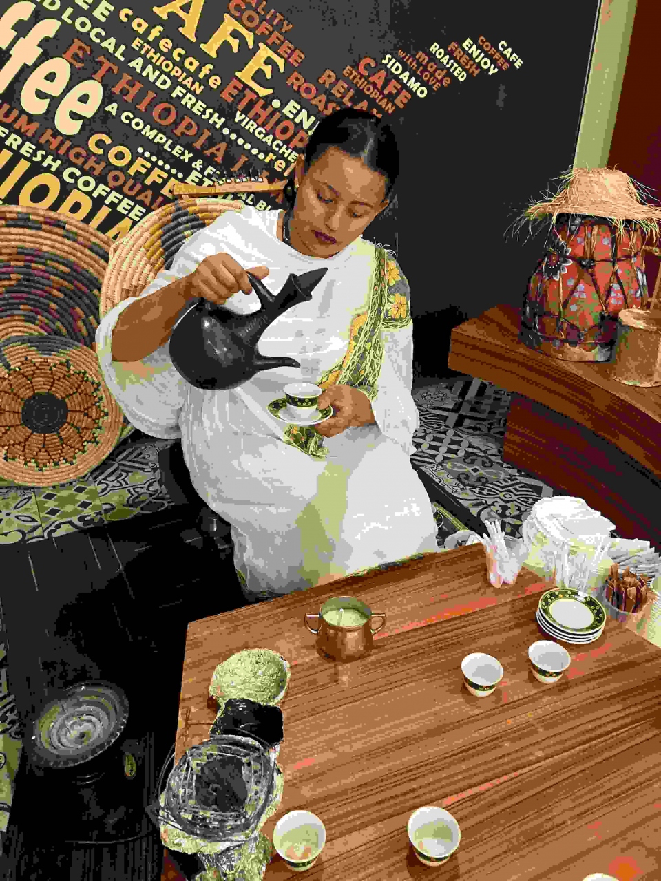 狭そうな入口の割に奥は広くて、入ってすぐにはエチオピアコーヒーが飲めるコーナーがあります。料理もレストランのブッフェのように色々あり、wifi速度も普通でした。