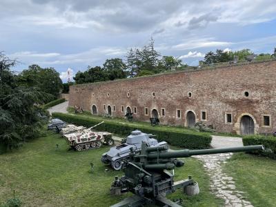 ガイドさんお勧めの場所は、公園の奥にある展望台で、サヴァ川が終わってドナウ川に変わる場所が見下ろせます。行く途中のお堀に数々の戦争で使われた戦車など武器が展示されていました。