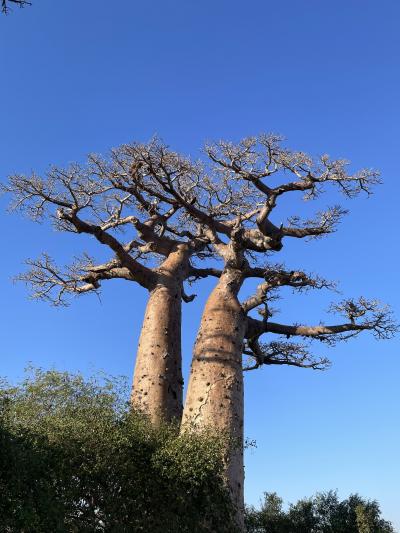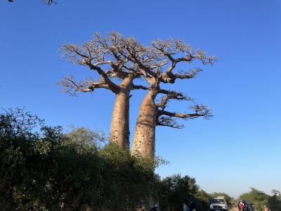 モロンダバから車で30分ほど走るとバオバブがちらほら見えてきて、45分ほど走ると双子のバオバブに着きます。双子、というのは幹が2本に分かれているということで、推定樹齢は600年ほど、という結構な太さのバオバブでした。