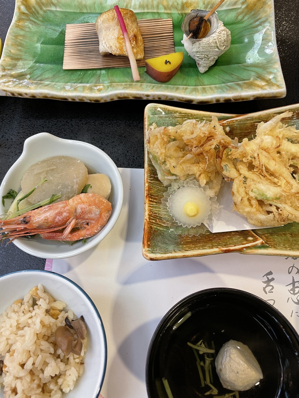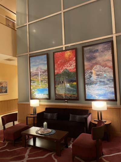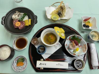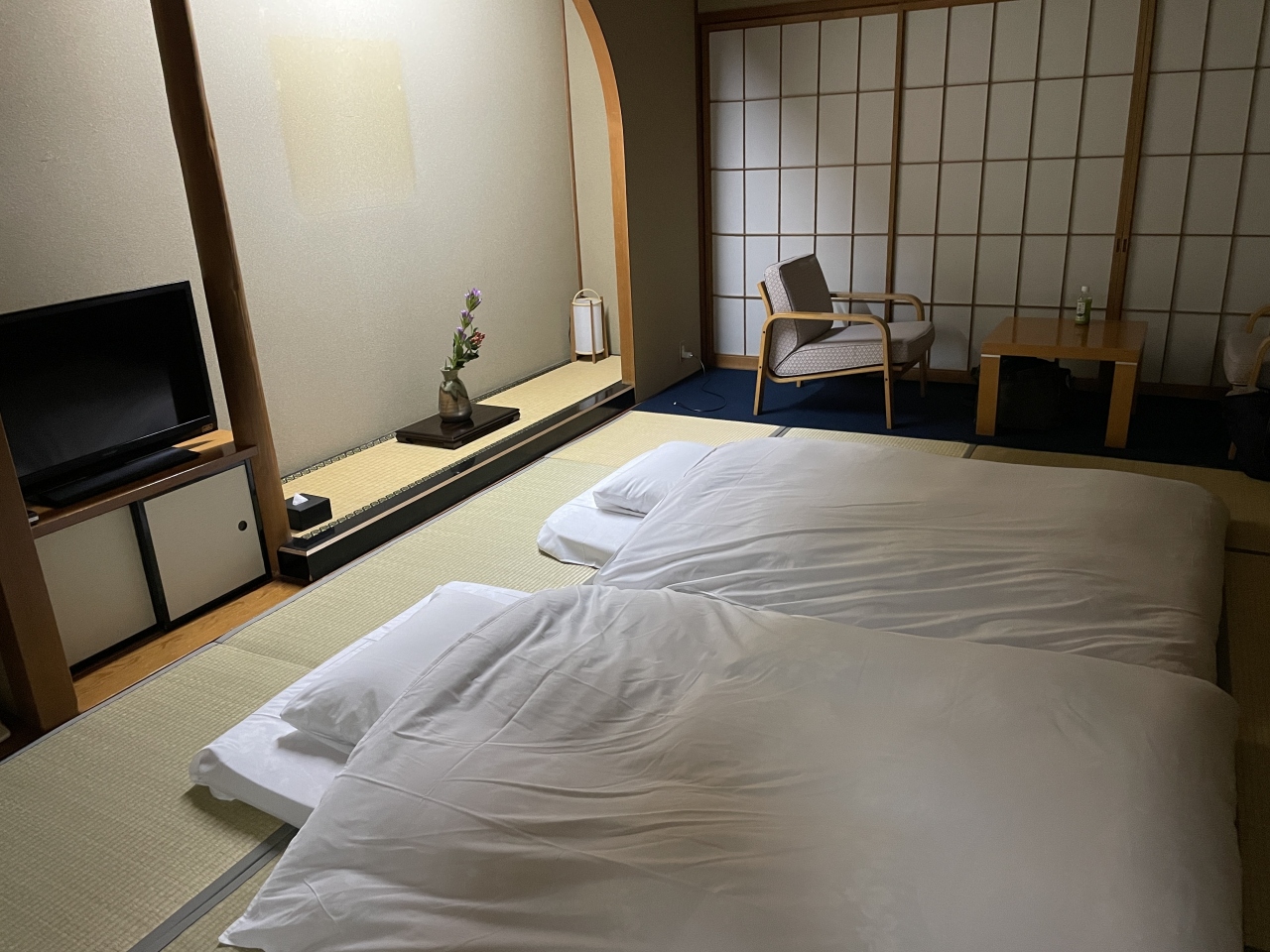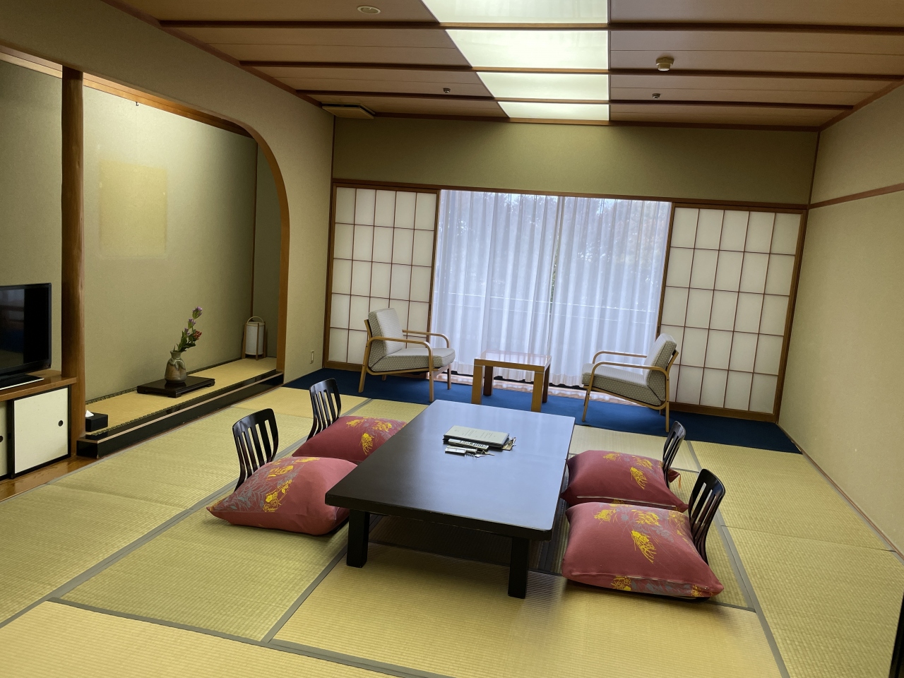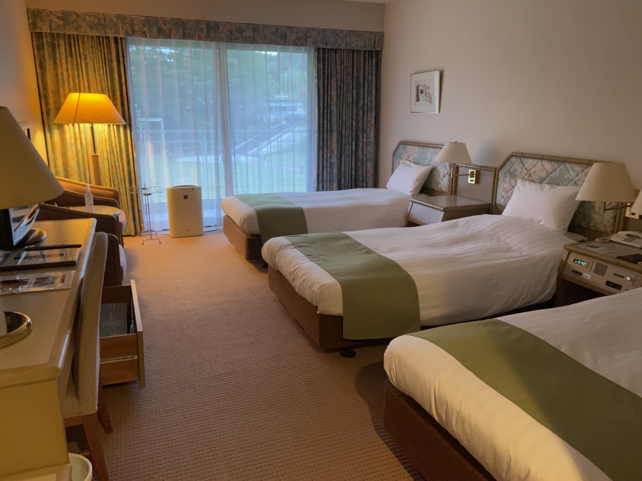 お部屋は古いながらも広いですが、時期的にカメムシが入るから窓は開けるなとのこと。夕食はバイキングでしたが、コロナ前は中国人団体客用だったのか、やたら中華料理が多く、食べる場所も舞台付きの大宴会場のような場所で給食のようなオレンジのトレイに載せて、なので雰囲気も何もありません。まずくはありませんが、ただ、食べるだけ、です。