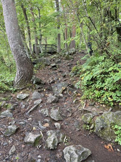 裏磐梯物産館から歩くとるり沼の看板があり、そのすぐ右側の岩場を上がっていくと木でできた展望台があり、そこから見下ろせます。が、反対側の観光プラザから歩くと、その看板は右向きなので振り返らないと見えず、るり沼の展望台への道も道というよりは岩場なので気づきづらいです。観光プラザから歩いた私たちは最初気づかずに通り過ぎ、物産館からの帰り道で見つけました。
