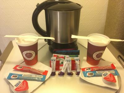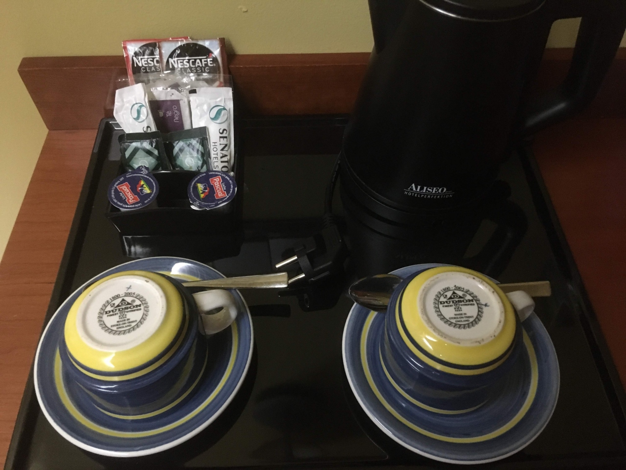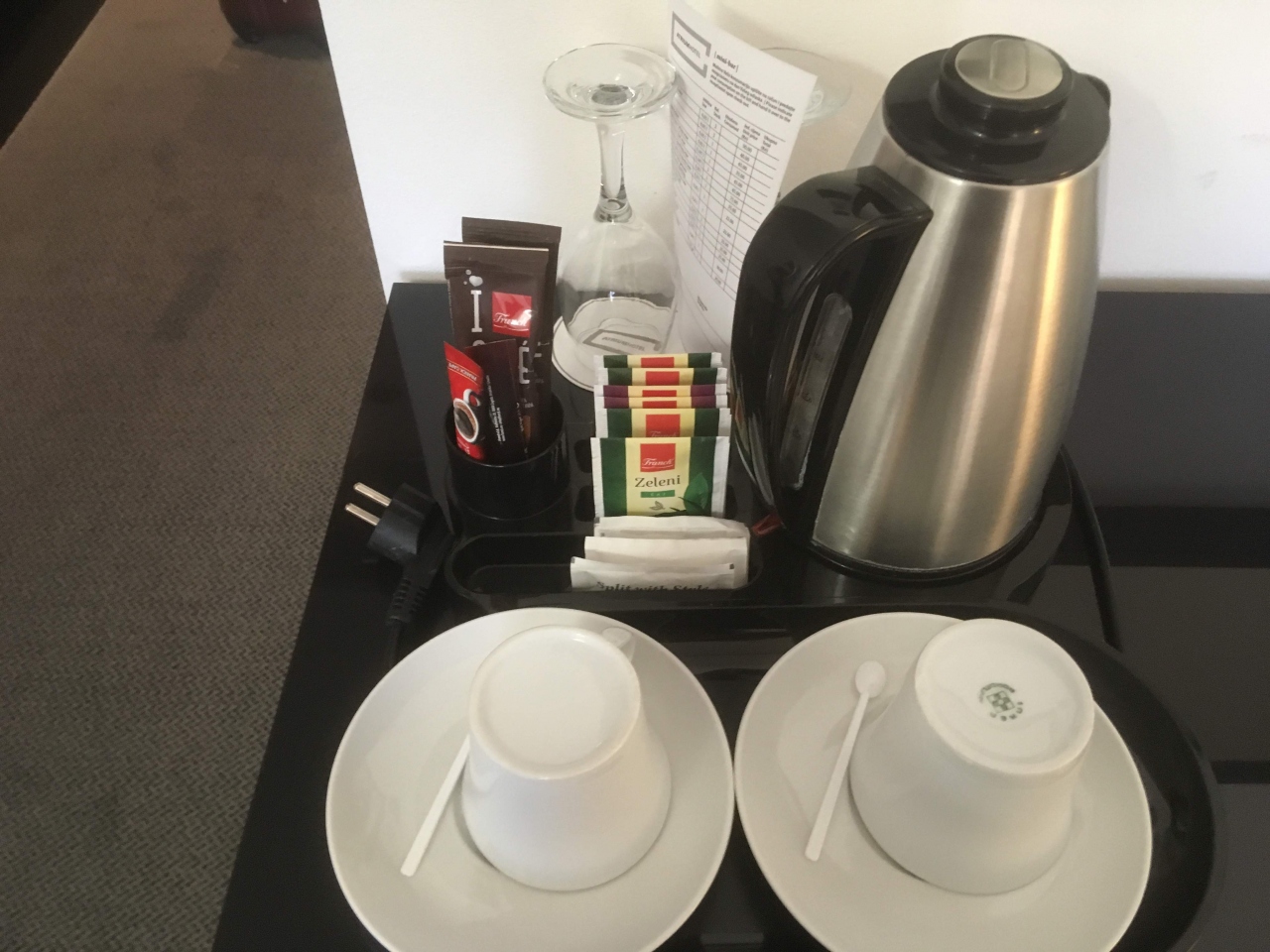 お部屋にはポットもありました。観光には少し不便かもしれませんが、サッカー目的の方なら便利なホテルだと思います。- 旅行時期