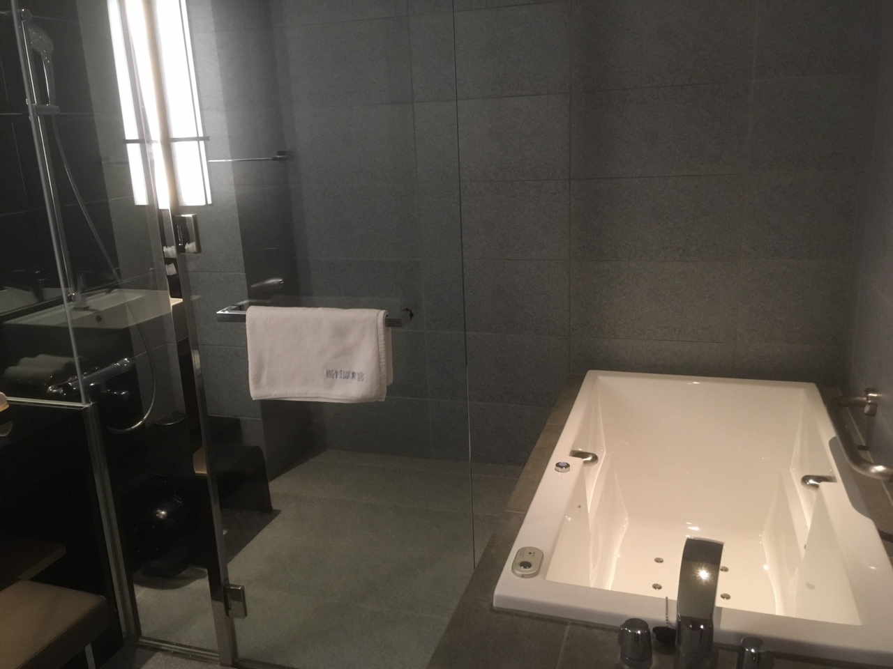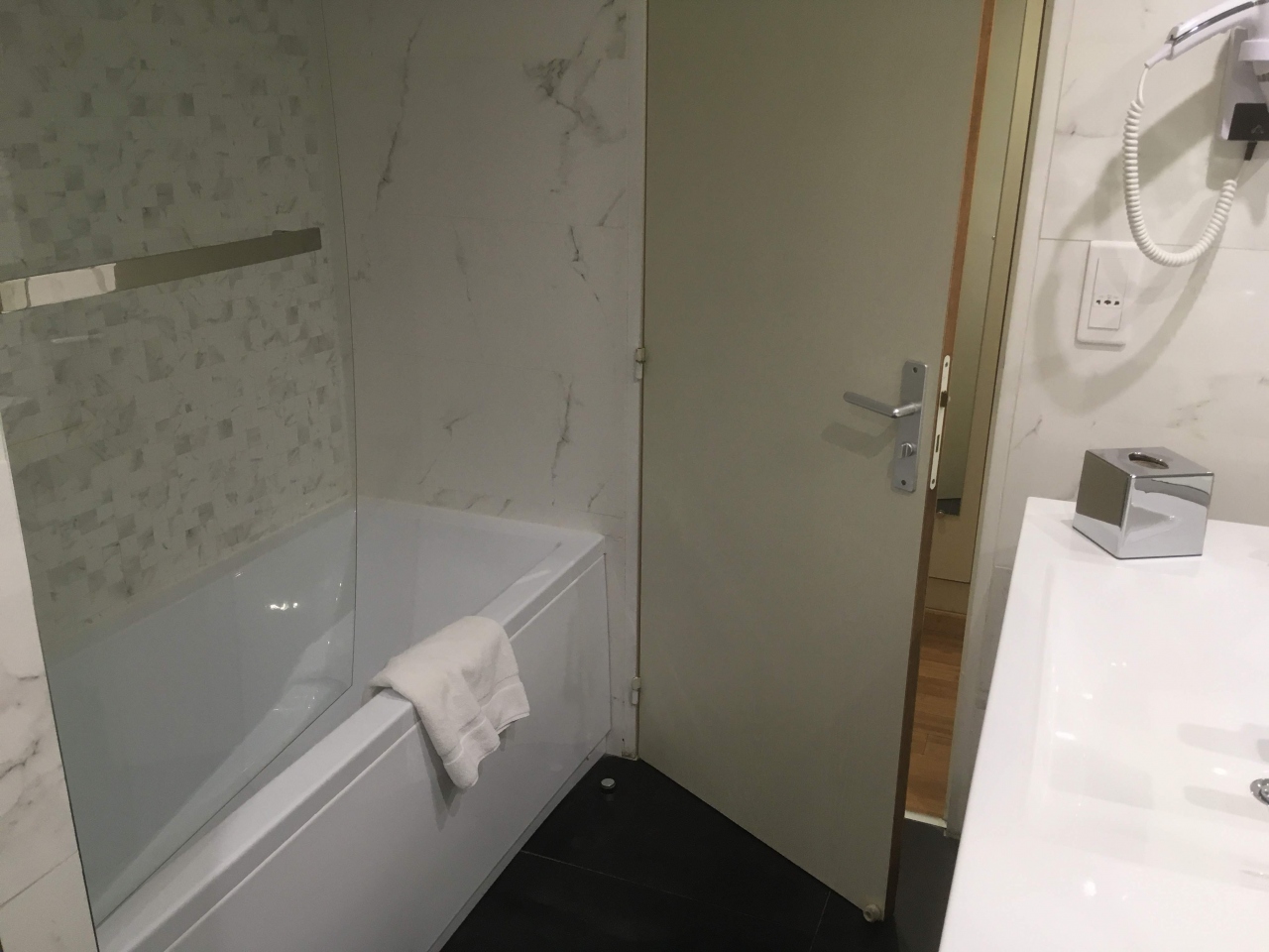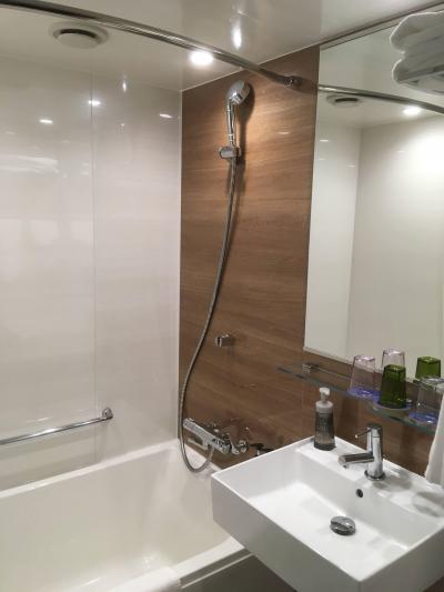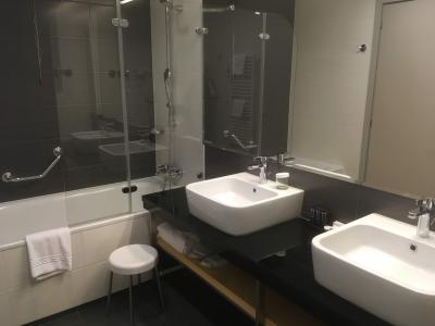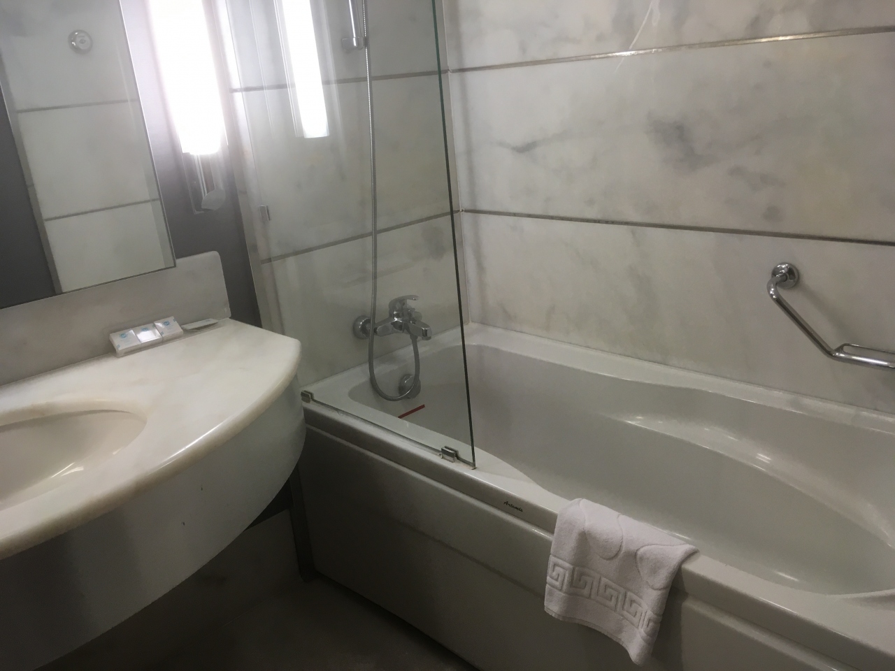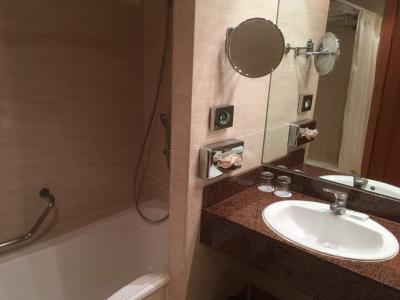 バスタブ付きでシャワールームは別にあり、ダブルシンクで使いやすかったです。朝食も夕食ビュッフェ(30ユーロ)も素晴らしく、さすがシェラトン、と素直に思えました。