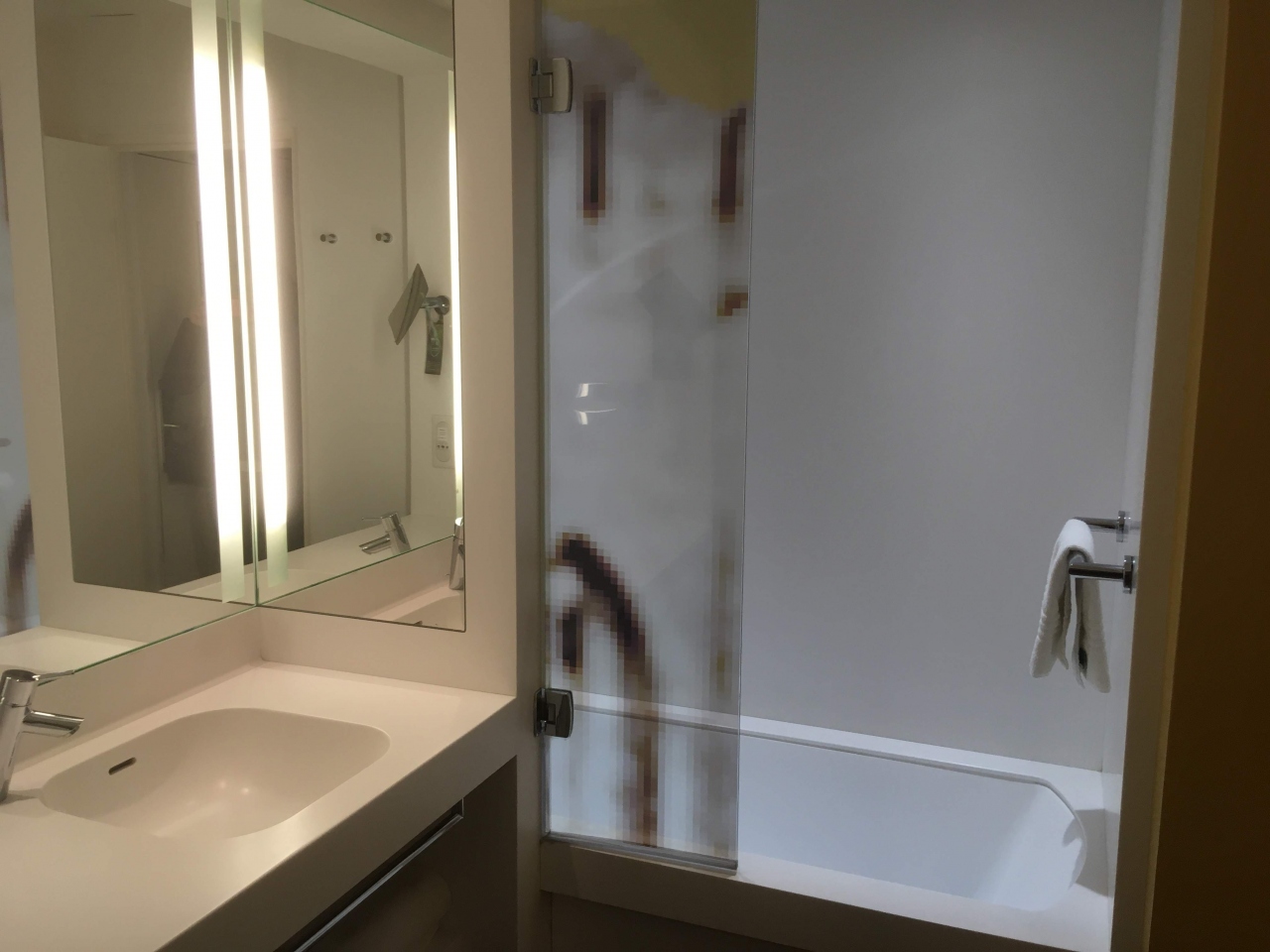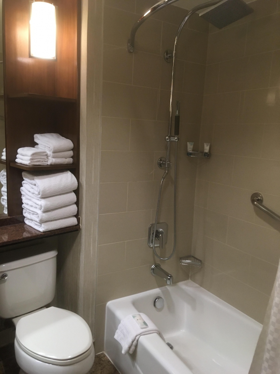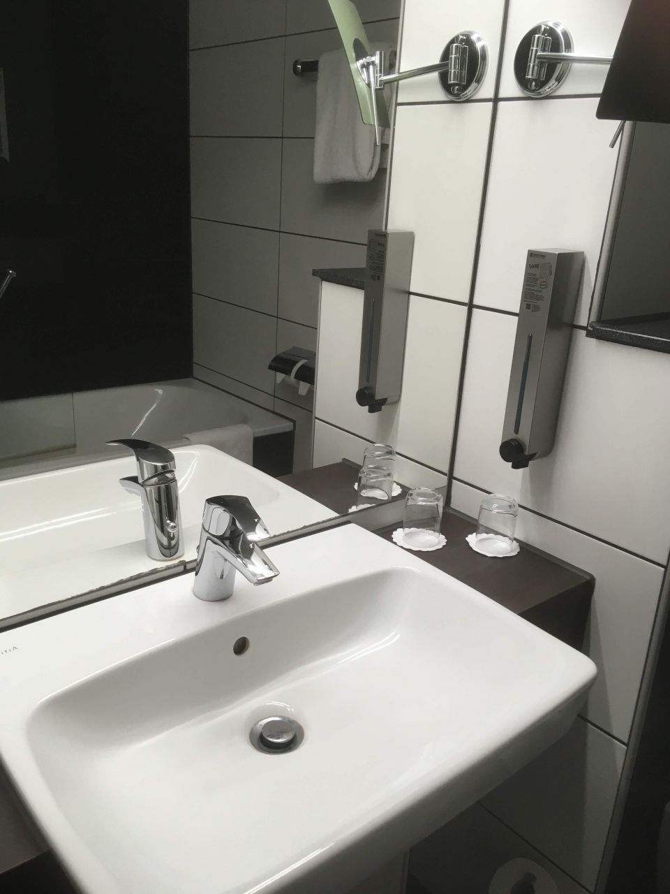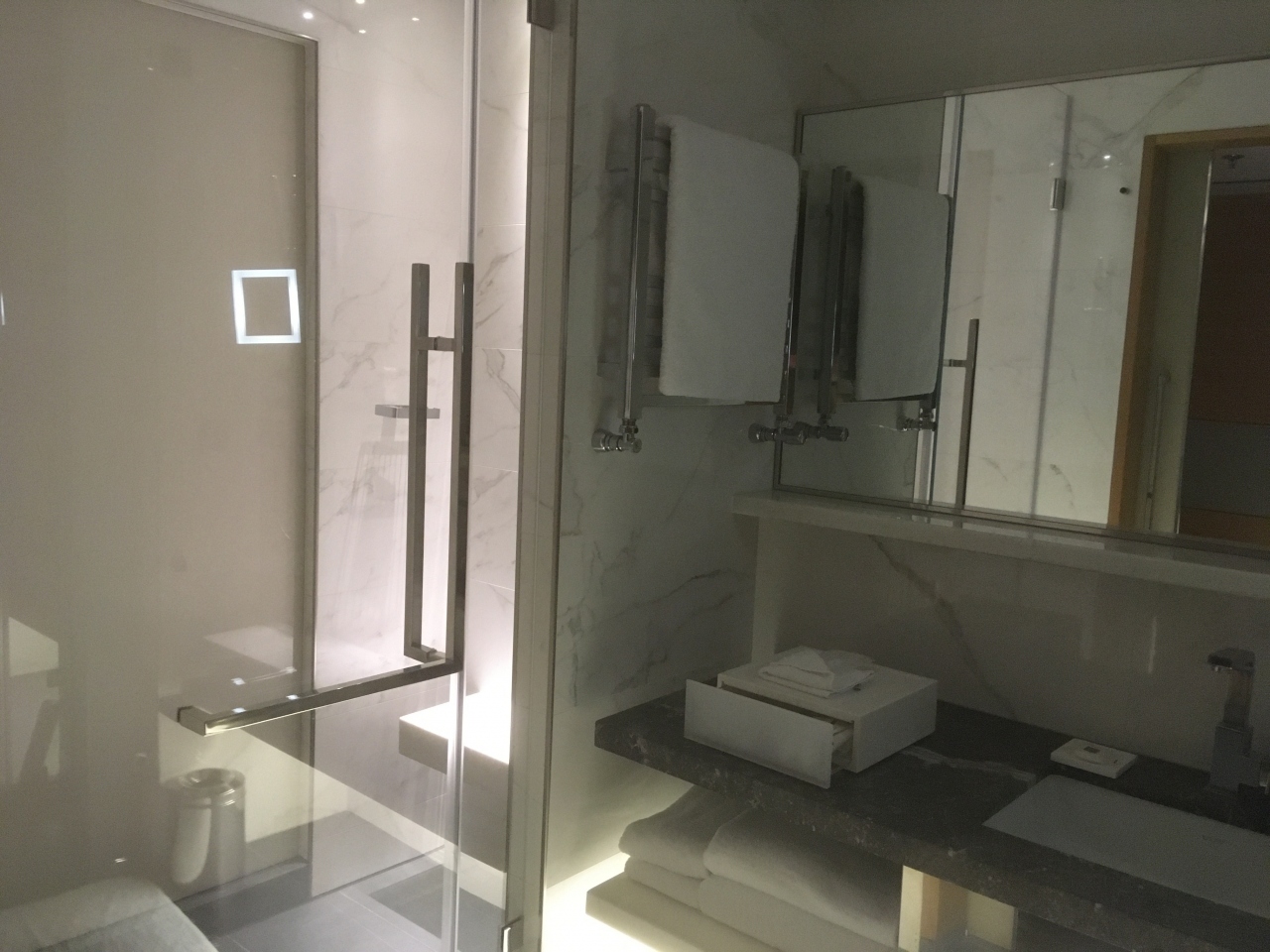 バスタブ付きでシャワールームは別にあり、ダブルシンクで使いやすかったです。朝食も夕食ビュッフェ(30ユーロ)も素晴らしく、さすがシェラトン、と素直に思えました。