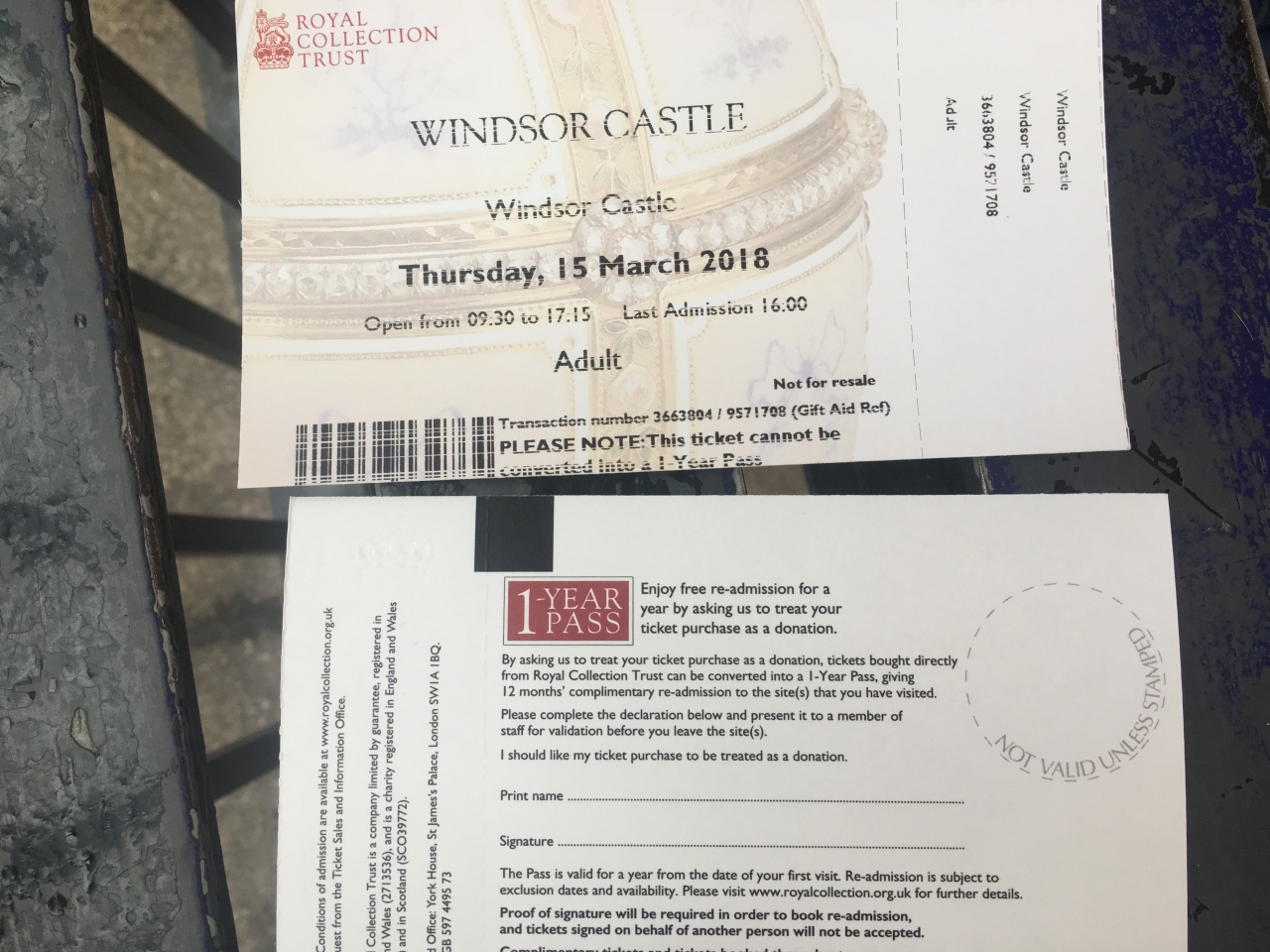 パディントン駅からオックスフォード行き、Slough駅で降りてWindsor行きに乗り換て一駅です。行きは急行だったのか、Slough駅まで止まらず、乗り換えもすぐに来たので40分かからずに到着しました。帰りは乗り換えに20分待ったので小一時間かかります。ロンドンパスを持っていたので交通費込だったのですが、行きはどこも検札がなく、帰り、パディントン駅の改札で駅員にロンドンパスを見せると通してくれました。
