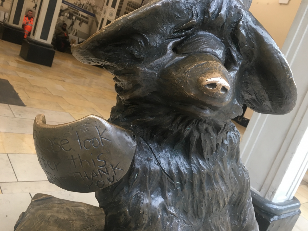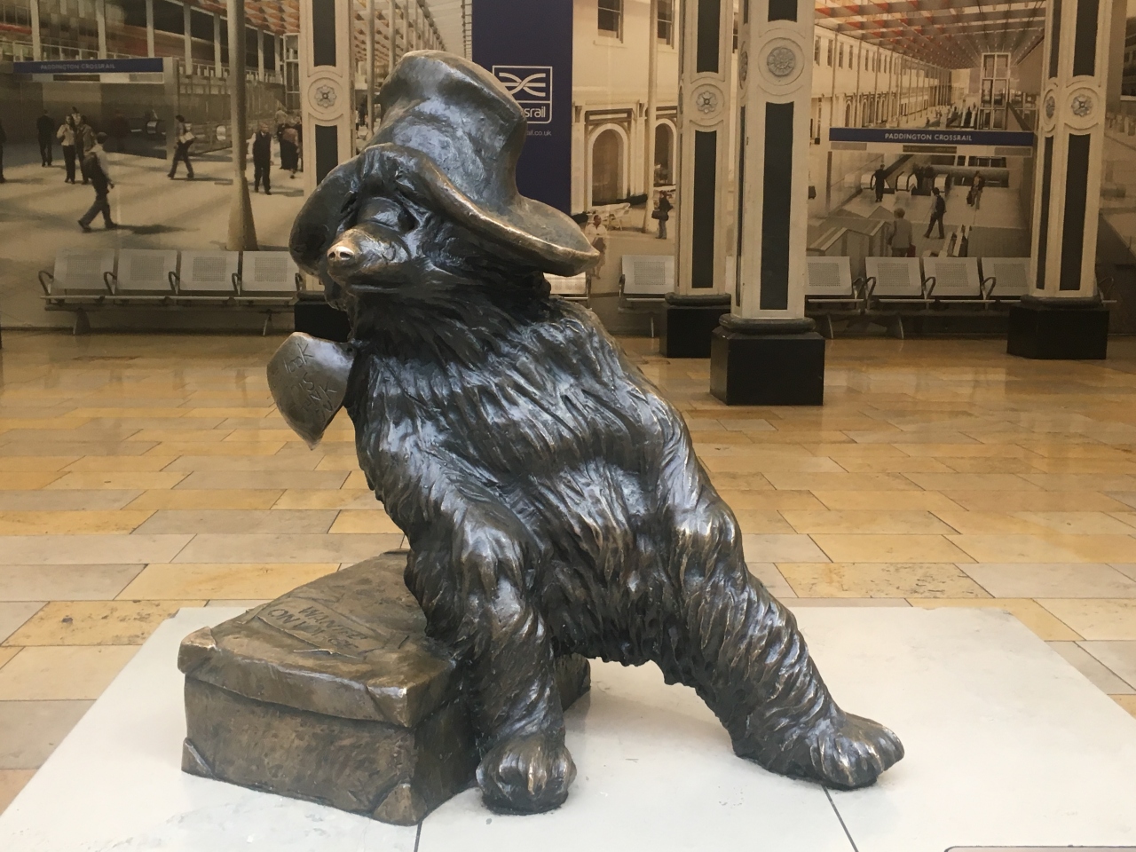 ウィンザーに行くためにパディントン駅を訪れましたが、目的はもうひとつ、くまのパディントンに会うことでした。銅像は1番線ホームの真ん中あたりに、ブラウン夫妻がパディントンと初めて会った時の挿絵そっくりの像があります。