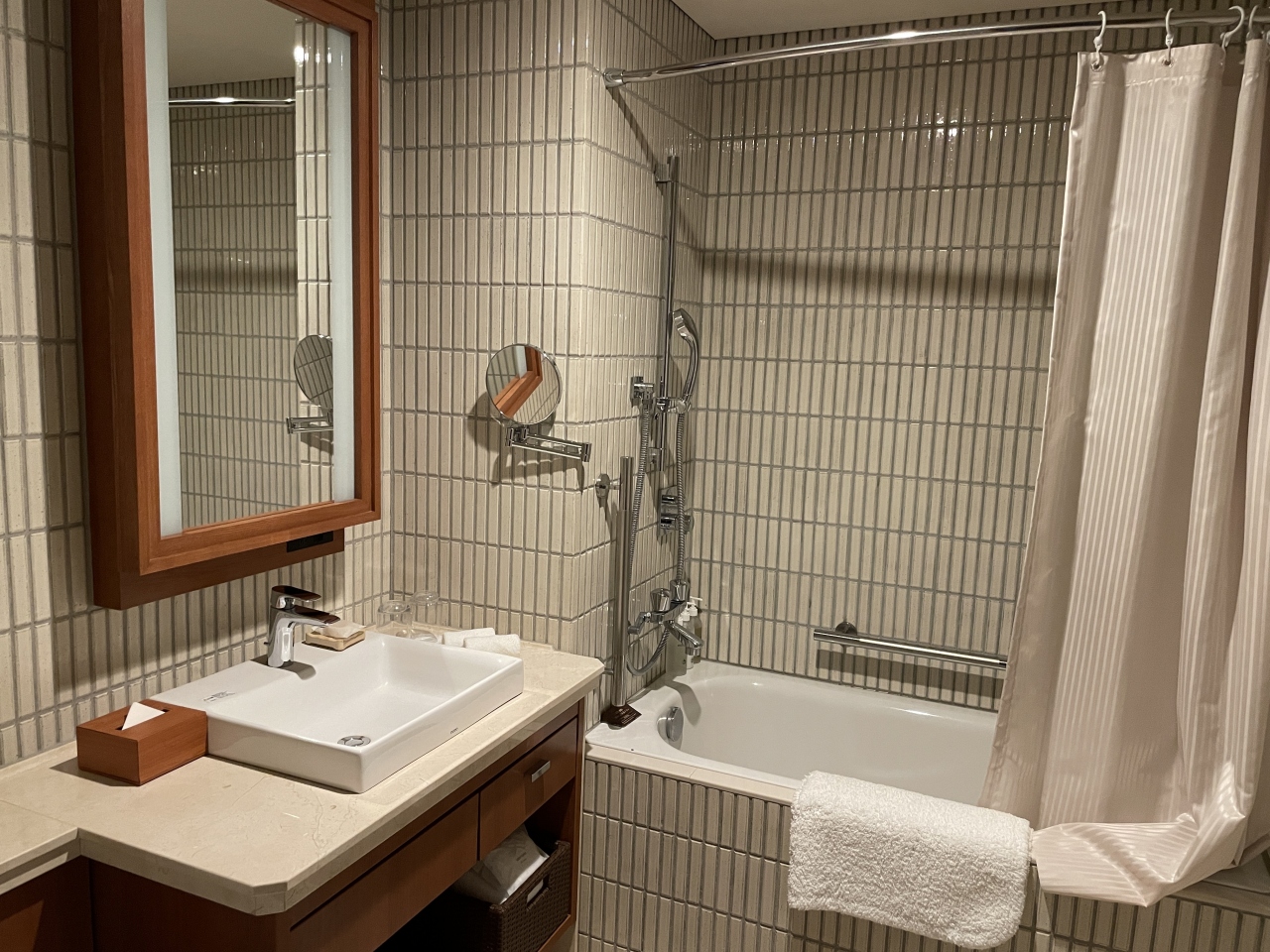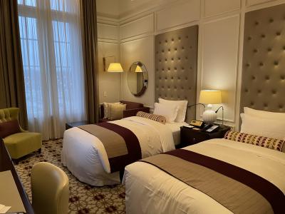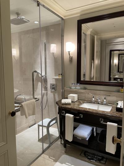 2度目の宿泊ですが、窓からは丸ビル、新丸ビル、真ん中奥に皇居前広場が見えていい景色です。お部屋も広く、お風呂は日本式にバスタブの外で身体を洗えるようになっています。コーヒーはネスプレッソ、基礎化粧品は雪肌精が置いてありました。- 旅行時期