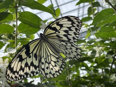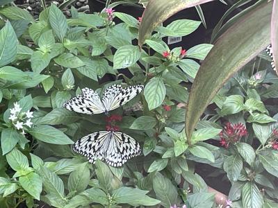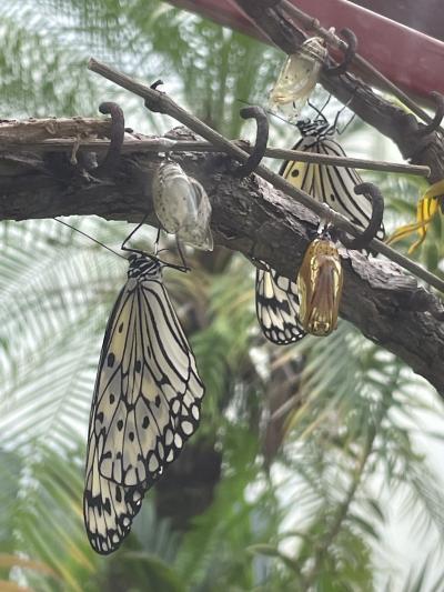 JALとANAのカウンターの後ろにオオゴマダが舞うエリアがあり、ガラス越しによく見えました。黄金に輝くさなぎもよく見えて感動しました。