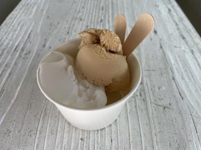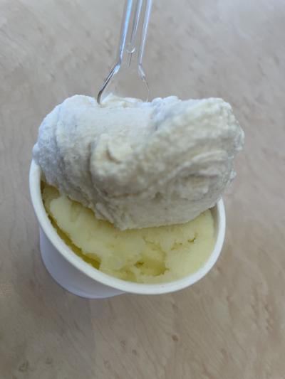 色々な種類があって迷ってしまいますが、珍しいピーナッツとシークワサーにしました。ピーナッツはおいしかったのですが、シークワサーはジェラートではなくシャーベットでした。2種選んでカップで550円と少し高めの値段でした。