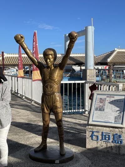 船の乗り場に具志堅用高さんの金色の像が立っていて、人気の写真スポットになっていました。
