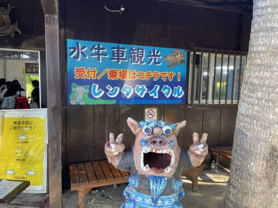 水牛の引く車に乗って竹富島の街並みの中をのんびり行きます。水牛は本当におとなしく、穏やかでマイペースに車を引いていきます。終わると一緒に写真撮影ができ、小さな写真は一枚無料でもらえました。牛で一周回ったのは20分でしたが、自分で歩くと7分の距離だそうです。
