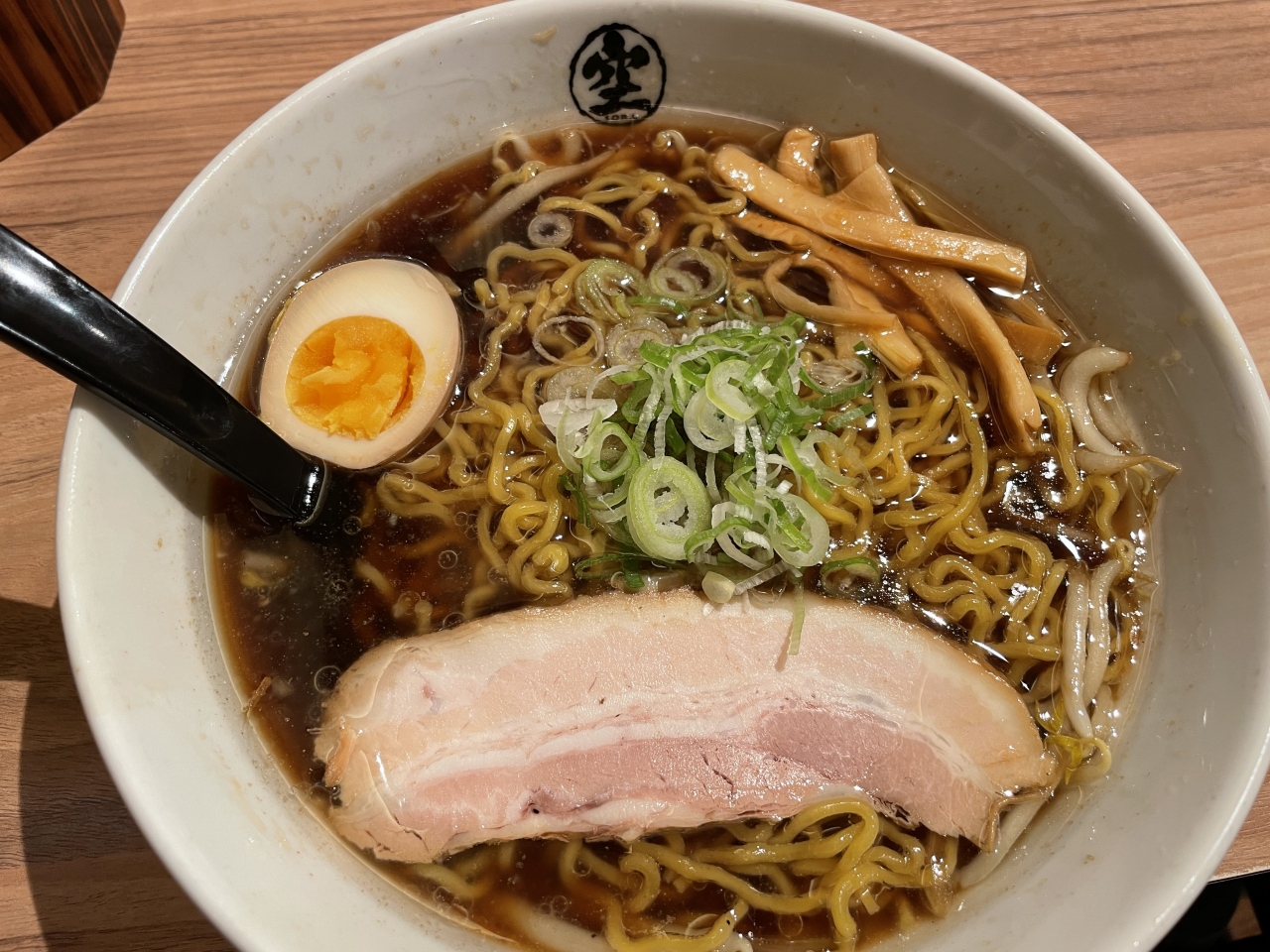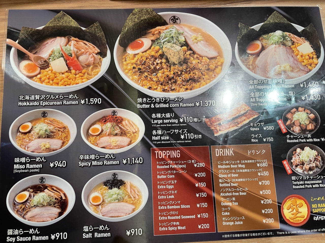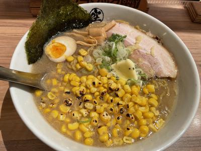 札幌で有名な味噌ラーメンのお店だそうですが、知らずに入店、新千歳空港限定の焼きとうきびラーメン1370円と醤油ラーメン910円をいただきました。味は、濃いです。醤油ラーメンは麺まで茶色に見えて、麺に醤油を練り込んであるのか、と思うくらい濃い味です。味に深みもあるので、スープをつい飲んでしまって後からのどがすごく乾きました。