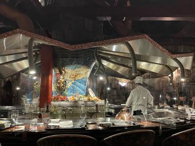 2人以上は個室に通されて、目の前の鉄板でお魚やお肉、ガーリックライスなど焼いて盛り付けてくれます。事前に誕生祝です、と伝えておいたので無料でプレートや薔薇の花を一輪、プレゼントしてくれました。ちゃんと棘が処理されていました。写真も撮ってくれて、最後にミニアルバムにしてそれぞれに渡してくれたりと、至れり尽くせりのサービスです。