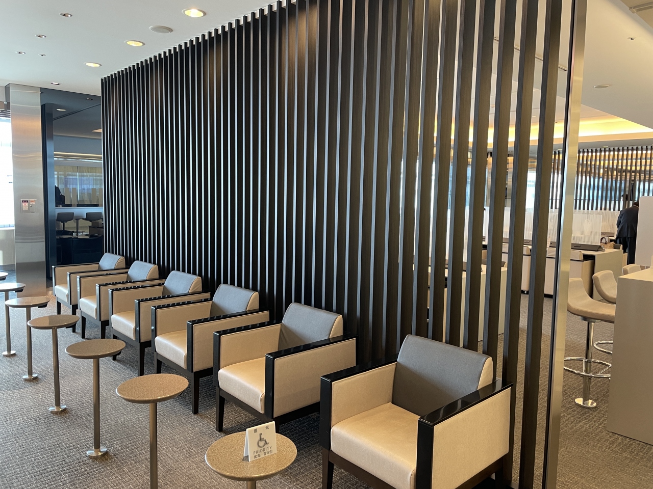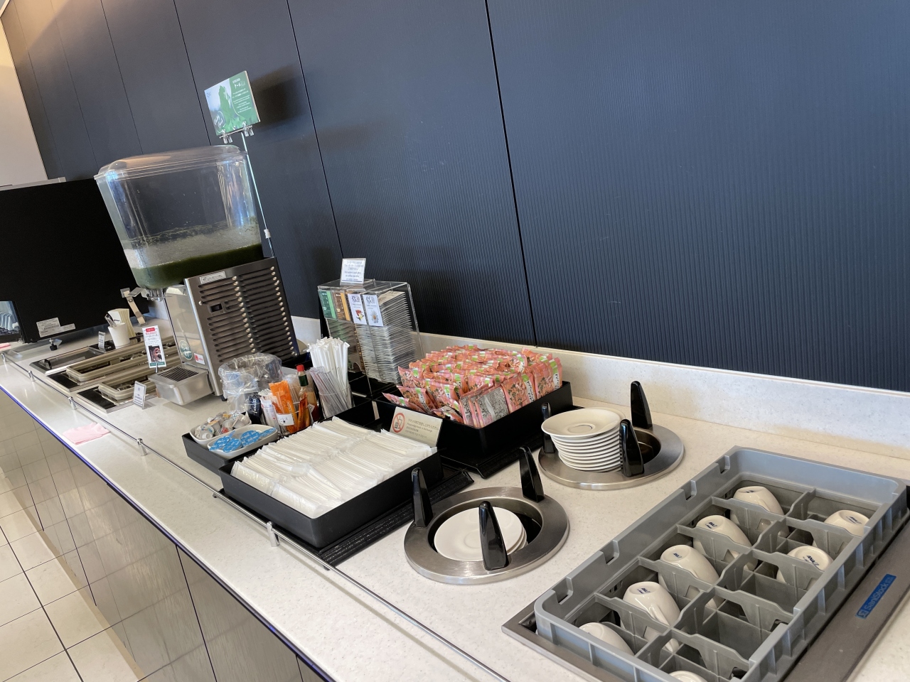 国内線のラウンジです。国内線なので、食べ物はブルボンのおかきの小さな袋があるだけですが、ドリンクはたくさんあり、ビールもスーパードライと一番搾りがありました。ソフトドリンクの変わったところでは、アセロラジュースの炭酸入りとなしがありました。出発前に一息つくのに落ち着ける場所です。