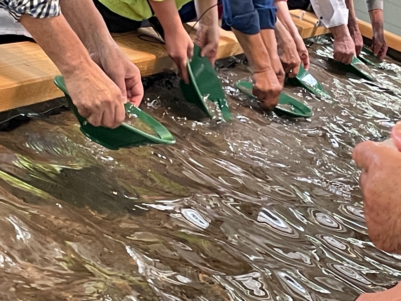 この辺りは昔、砂金が取れたそうで、そのためにこのような施設ができたようです。砂金取り体験は砂と水の入ったレーンに並んで、プラスチックの入れ物に砂をすくって、水の中で揺らしながら砂をはらっていくと、相対的に重い金だけが残ります。結構根気のいる作業で、取れる金は砂粒程度。それでも小さな入れ物に入れて持って帰れます。私たちに続いて小学校の修学旅行生がやってきていました。- 旅行時期