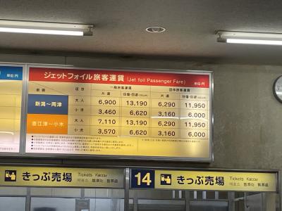 待ち時間が1時間ほどあったのですが、そんなに広くないお店が意外に充実していました。新潟や佐渡のお土産や、コンビニのような普通のお菓子やドリンク類、お弁当なども置いていました。新潟に本社のあるブルボンのアイスも売っていました。ジェットフォイル専用の待合室があり、無料wifiも普通の速度で使えました。- 旅行時期